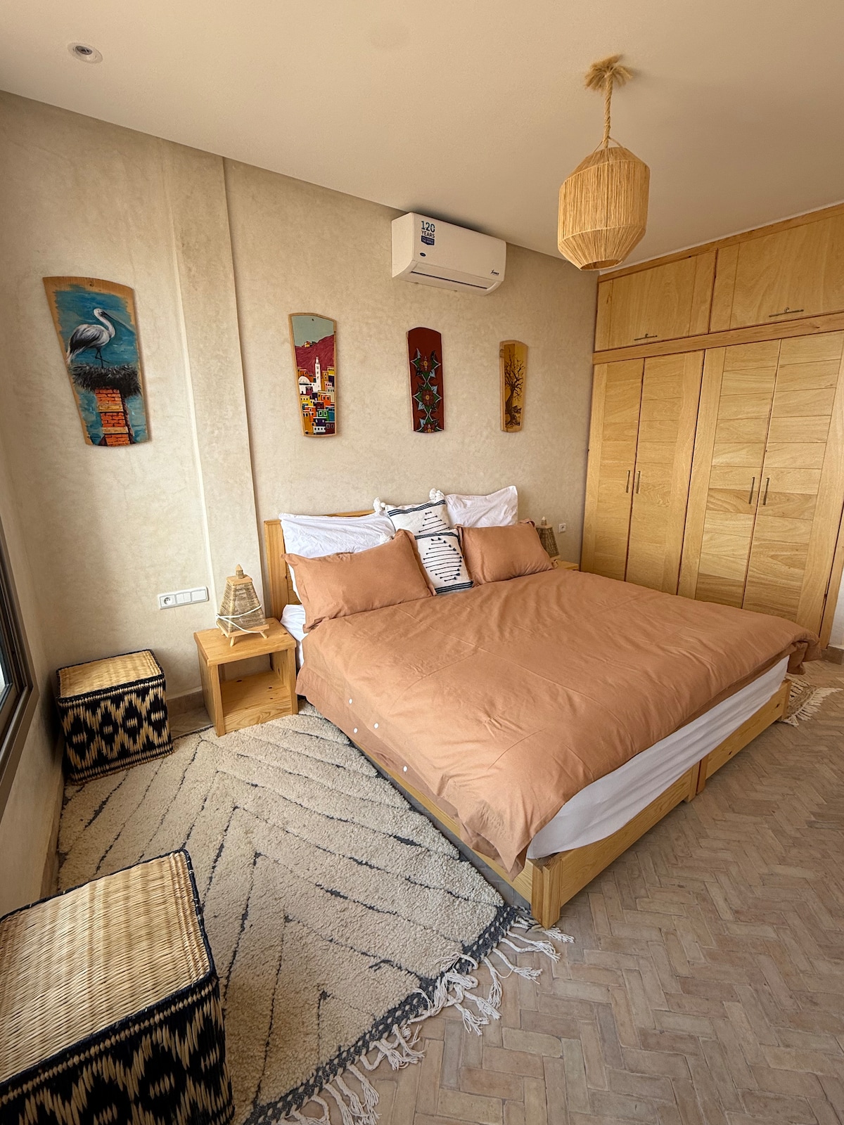 The apartment is located in the center of Taghazout, close to everything. It has a spacious wooden bedroom that makes you feel relaxed and at ease, as if you're in a different place altogether. Apartment The apartment is 50 square meters, suitable for two people. It features a large room with a king-size bed (170 cm x 200 cm), a bathroom with a shower, a kitchenette, and a balcony with direct views of the sea and mountains.