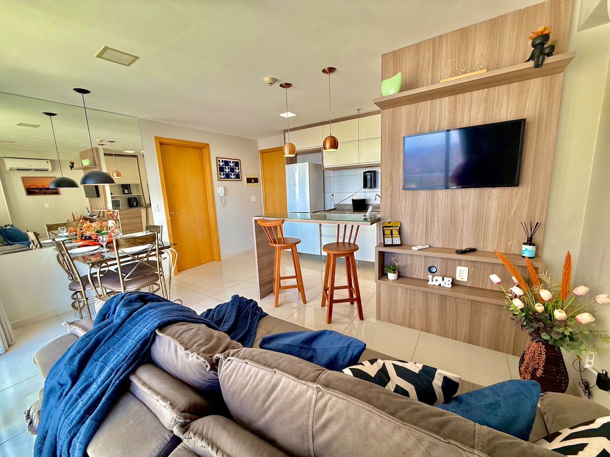 Luxurious apartment with panoramic views and direct access to DF Plaza Shopping. The bedroom has a queen bed, a living room with a 55" Smart TV, and a fully equipped kitchen and bathroom. Prime location: restaurants, supermarkets, and metro nearby. The condominium features an infinity pool, gym, workspace, and more. Fast Wi-Fi, private parking, and 24-hour security. It is ideal for couples, professionals, and discerning tourists. Peaceful environment. Experience the best with sophistication.