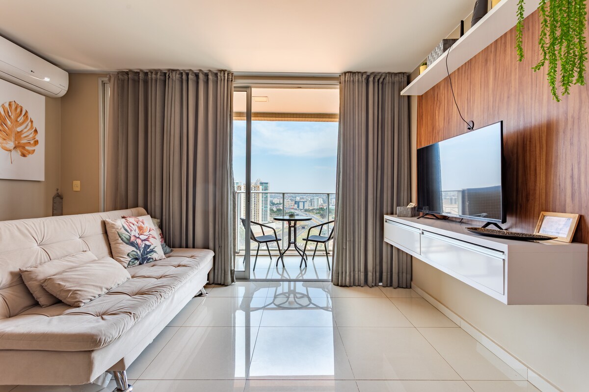 Apartamento de luxo com vista panorâmica e acesso exclusivo ao DF Plaza Shopping. Ambiente sofisticado, totalmente automatizado via Alexa (luzes, ar-condicionado, TV e persianas). Quarto com cama queen e travesseiros ergonômicos; sala com sofá-cama e Smart TV 65". Cozinha gourmet completa e banheiro com amenidades premium. Condomínio com piscina infinita, academia e espaço de trabalho. Wi-Fi ultrarrápido, estacionamento privativo e segurança 24h. Perfeito para casais e profissionais. Toque zen.
