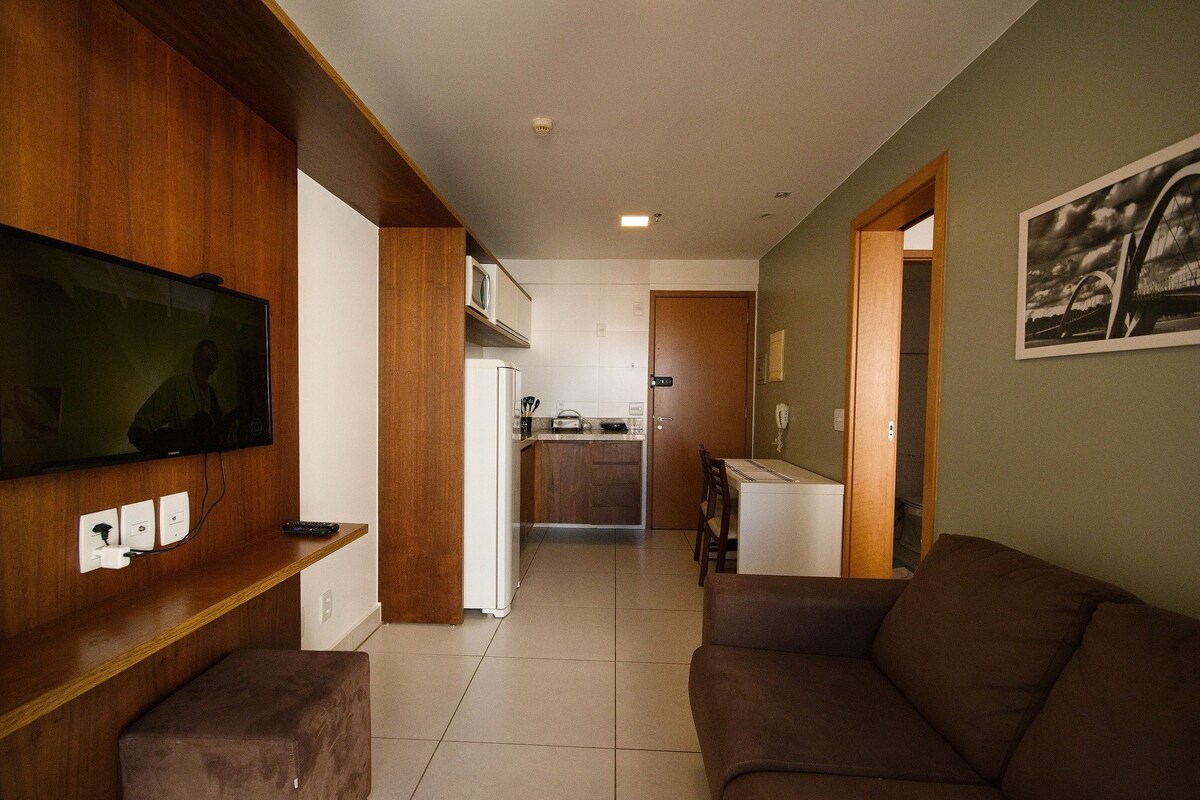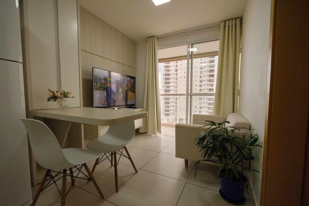 Próximo ao aeroporto, estação do metrô e o melhor shopping de Brasília. Fácil acesso aos centros comerciais e de lazer. Aconchegante e de bom gosto, estacionamento privativo, wi-fi, TV à cabo, Netflix, ar condicionado na sala e quarto, microondas, forno elétrico, fogão, geladeira, cozinha equipada. O condomínio tem a opção de 3 restaurantes com variado cardápio e café da manhã, almoço e lanches, além de uma conveniência auto service 24 horas. Piscina, Sauna e Academia. Todo enxoval novo.