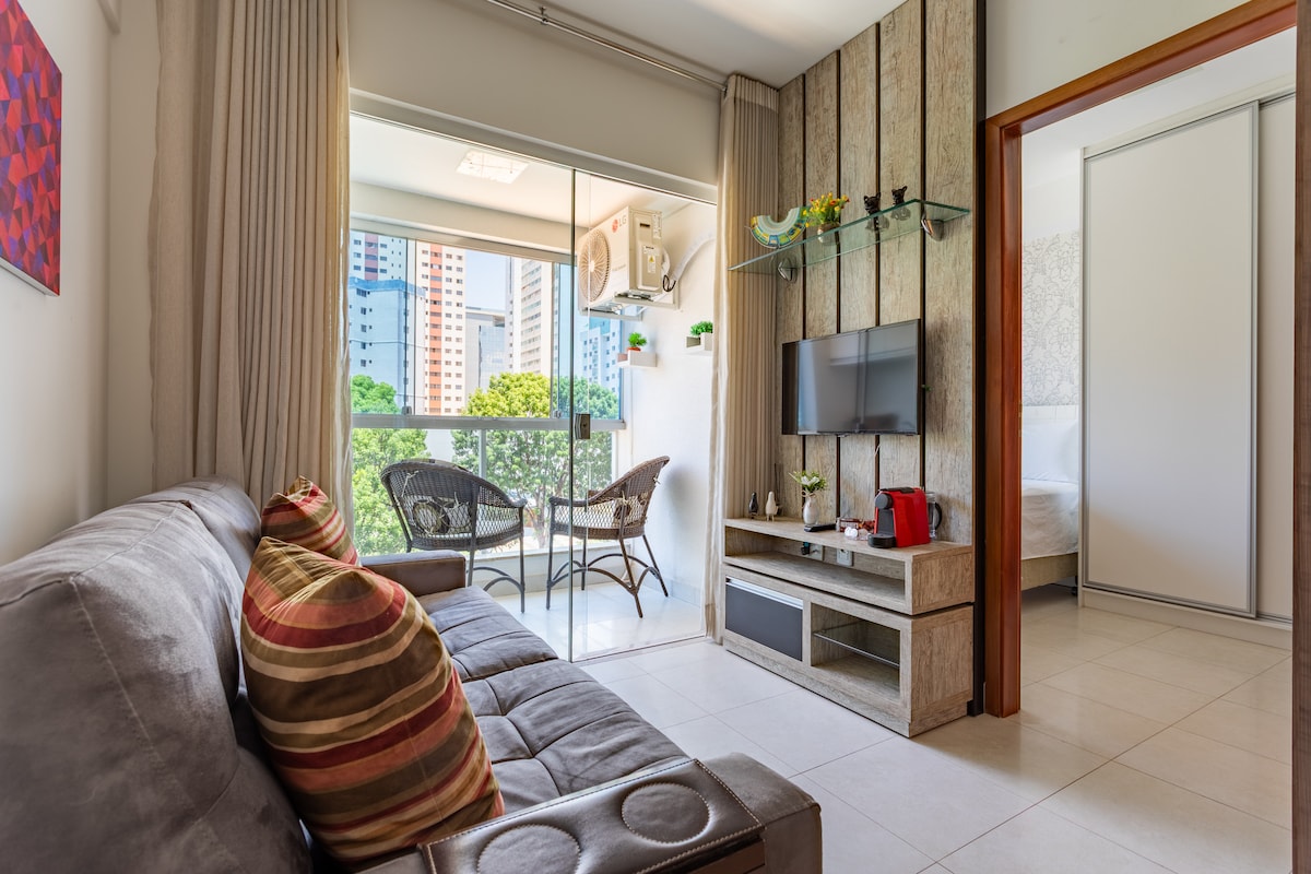 Charmosa Kitnet bem dividida em dois ambientes. O quarto conta com uma confortável cama Queen Size, jogos de cama novos e toalhas de banho e rosto para os hóspedes. A cozinha conta com panelas, utensílios de cozinha, louça e talheres para três pessoas. O apartamento tem ainda ar-condicionado, geladeira com congelador, microondas, Wi-Fi e TV a cabo e sofá-cama na sala. O condomínio está localizado a apenas 10 minutos do aeroporto e do centro de Brasília e ao lado de Shopping Center e rodoviária