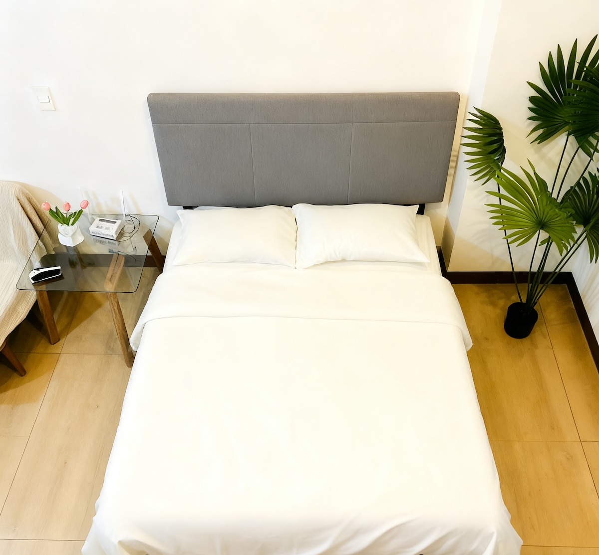 A cozy modern Scandinavian/tropical retreat nestled in the heart of the city. This is a place where you can relax, unwind and have fun with your loved ones or just by yourself. The living area is adorned with light-colored wooden floors, providing a warm and welcoming ambiance. Furnished with simple yet stylish Scandinavian/Tropical furniture. The kitchen is fully functional. Equipped with all your cooking needs. The bedroom’s minimalist design will for sure give you a restful night’s sleep.