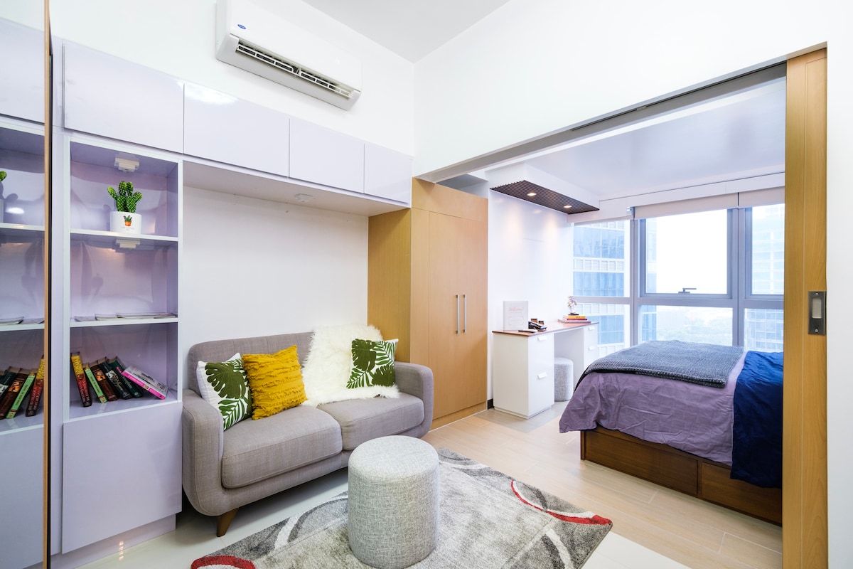Feel stylish and experience the BGC vibe at this centrally-located place. Get direct access to Uptown Mall. This place is also just across the newly opened Mitsukoshi Mall. Our newly renovated place is bright and airy with a fantastic view of the Uptown Mall fountain show. Take an easy stroll as all major points of interests are just a few mins walk. Feel the energy of Uptown BGC. Shop, dine, or just have a relaxing break at the corner cafe. Come feel the energy of this vibrant community!