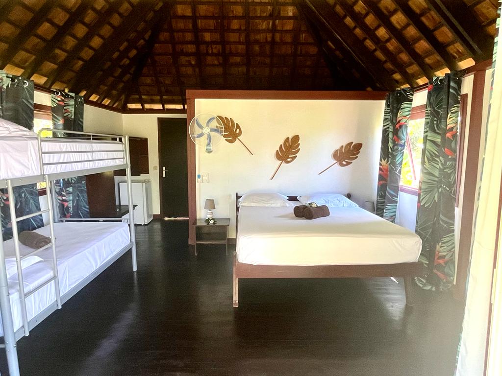 Bungalow de 36 m2 avec salle de bain privative et petite terrasse extérieure. Idéal pour une famille ou pour des amis avec son grand lit double et son lit bateau. Le bungalow est climatisé avec l’accès au wifi. Il est équipé d’un petit réfrigérateur, d’une télévision, de linge de toilette. Des vélos et des kayaks sont à disposition des voyageurs. Une agence de location de voiture est présente sur le site et nous proposons des excursions sur l’île.
