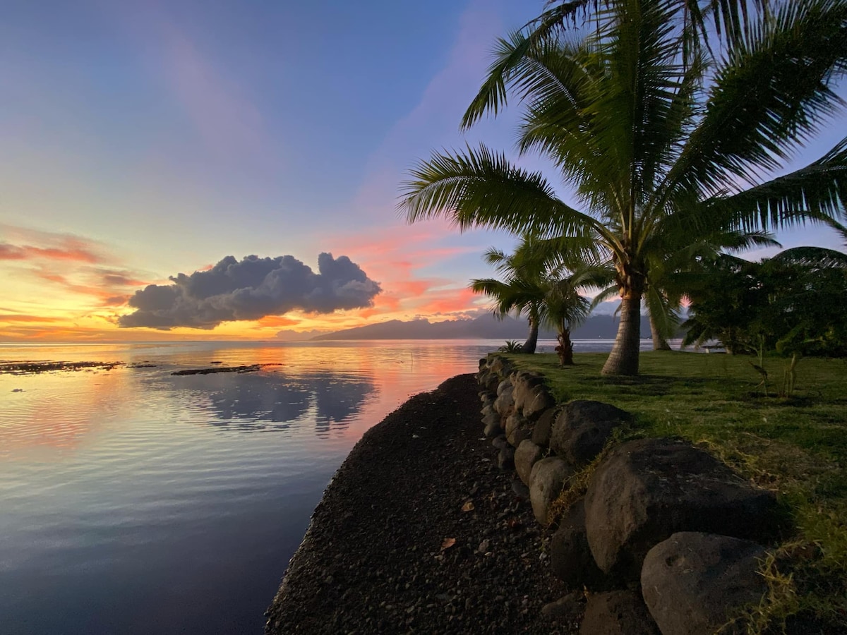 Bungalow duplex dans propriété privée, Aéroport international et inter-îles à 10minutes en voiture. Terrasse privative avec ponton à fleur du lagon où la baignade s'offre à vous. 2 kayacs pour ballades et accès au banc de sable , à 100 mètres du fare Vaima. Au rez-de-chaussée, espace cuisine équipée +salle à manger + une salle de bain. A l'étage, une grande chambre climatisée+terrasse avec vue imprenable sur Moorea et ses somptueux coucher de soleil. Supermarché ouvert 24h/24 à 10 mn à pieds.