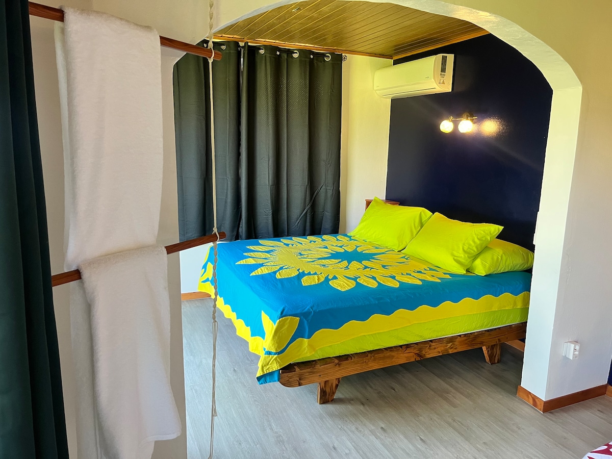 Profitez d’un bungalow indépendant comprenant une grande chambre, une terrasse privée, une cuisine et une salle de bain rien que pour vous. Depuis votre espace, admirez la forêt environnante et le lagon, à 400m d’altitude. Dans les espaces communs, vous aurez accès à une vaste terrasse offrant une vue imprenable sur Moorea et le coucher du soleil, ainsi qu’à la piscine et au jacuzzi. Une cuisine équipée et professionnelle partagée est également à votre disposition. Parking sécurisé et gratuit