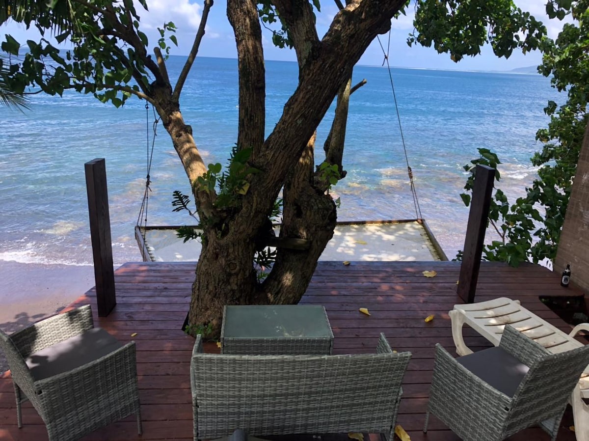 Bungalow duplex indépendant, bord de mer, situé dans une propriété privée. 1 chambre climatisée avec 1 grand lit 2 places + 1 canapé-lit. Un espace cuisine et salle de bain. Terrasse privative exterieure dans jardin bord de l'eau. 2 kayaks à disposition pour accéder au banc de sable à 100 mètres du faré et au spot de surf de Taapuna, à 800 m. Aéroport international /inter-îles à 10 minutes en voiture. Supermarché ouvert 24h/24 à 10 minutes à pieds. Restaurants, snack et roulottes à proximité.