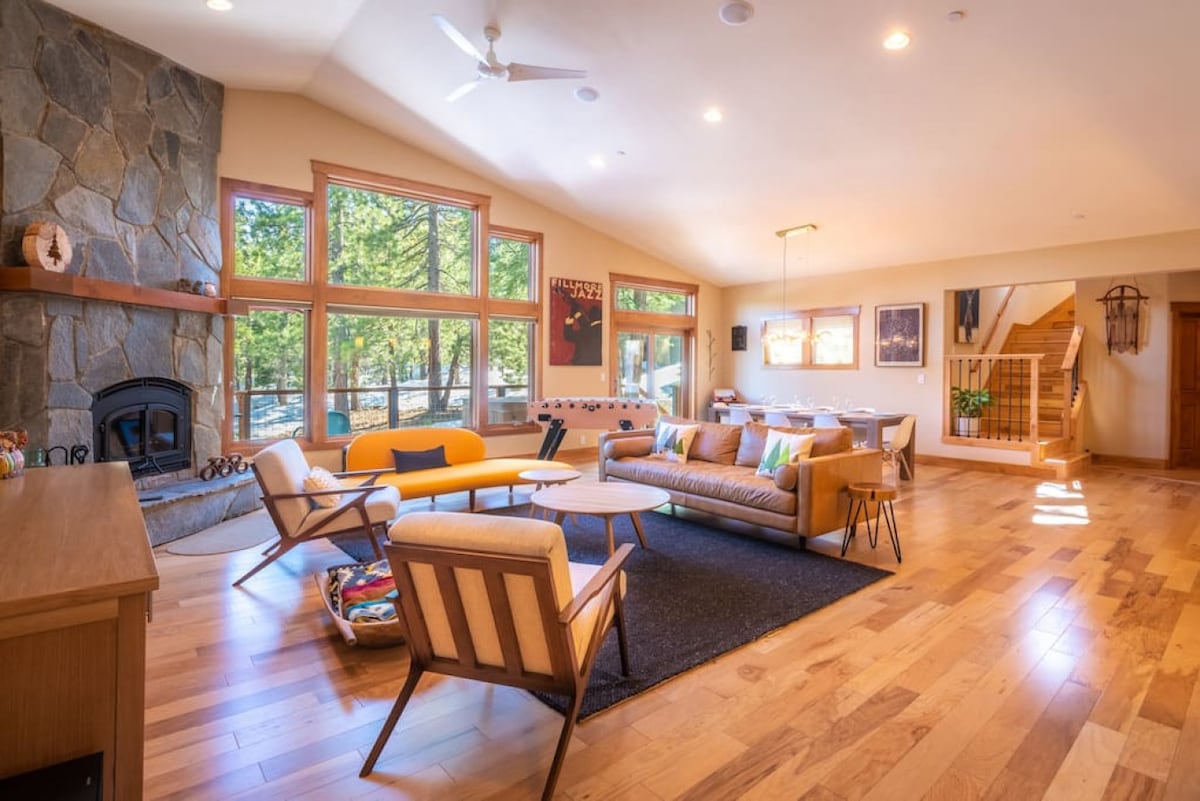 Newly remodeled with higher-end and modern designer touches, and a hot tub on the back deck! Single story and open-concept living area, chef's kitchen with higher-end gas range, larger dining table and extra seating at the breakfast bar, door opening up to fresh pines, large deck, and large open area for kids to play. Kids reading loft, bunk beds, arcade table, Smart TV's. Located in Tahoe Donner's resort neighborhood, guest access to pools, saunas, gym, and other amenities.
