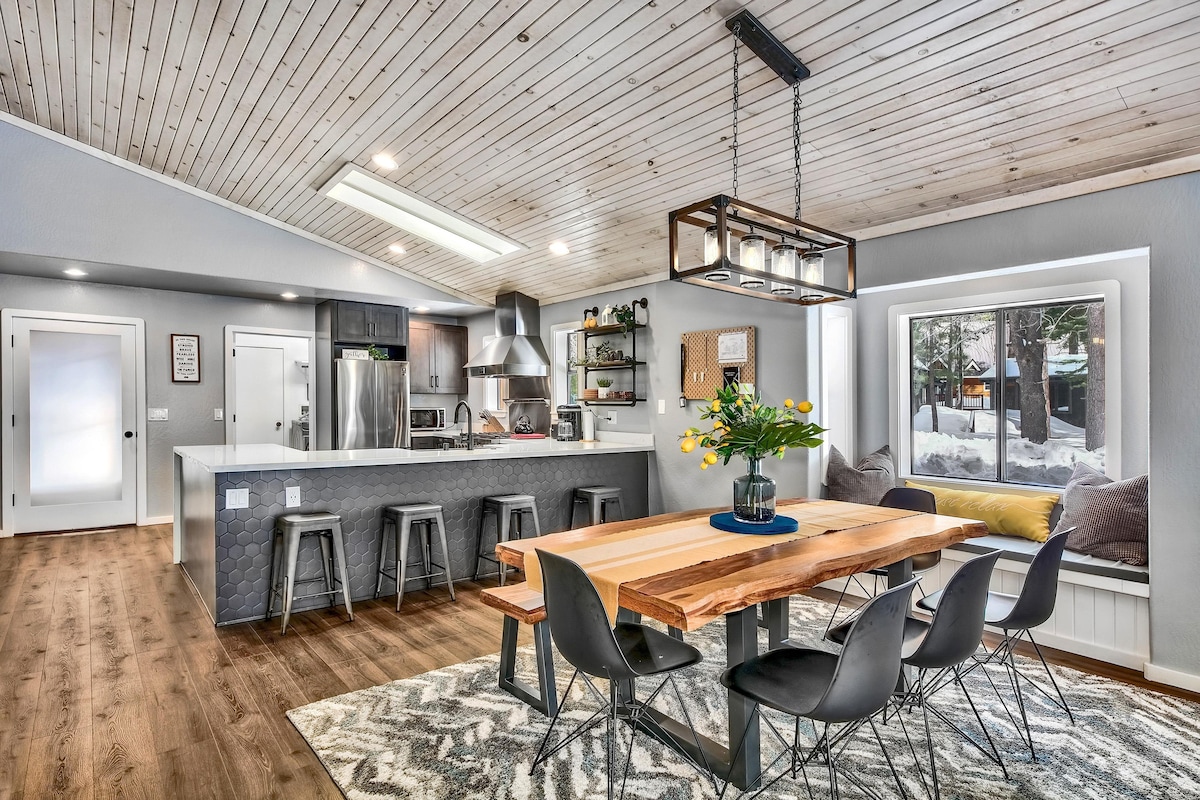 Newly remodeled with higher-end and modern designer touches, and a hot tub on the back deck! Single story and open-concept living area, chef's kitchen with higher-end gas range, larger dining table and extra seating at the breakfast bar, door opening up to fresh pines, large deck, and large open area for kids to play. Kids reading loft, bunk beds, arcade table, Smart TV's. Located in Tahoe Donner's resort neighborhood, guest access to pools, saunas, gym, and other amenities.