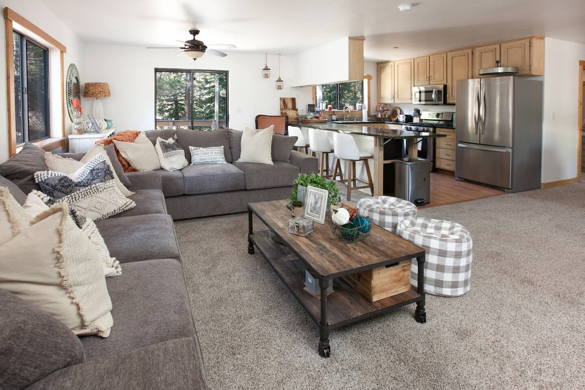 Welcome to your sunny home in the beautiful Tahoe Truckee Sierras! Tahoe Donner is a fun-filled community with many activities and a rec center with a hot tub, sauna, swimming pool, tennis, pickle ball, bocci ball, and full gym. Golf, Private Lake and Beach access, and an affordable ski hill. A cozy, comfortable haven to relax after playing in the snow or sunning at the lake, with a complete kitchen ready to cook a big family meal and an open common area to spend time with friends and family.