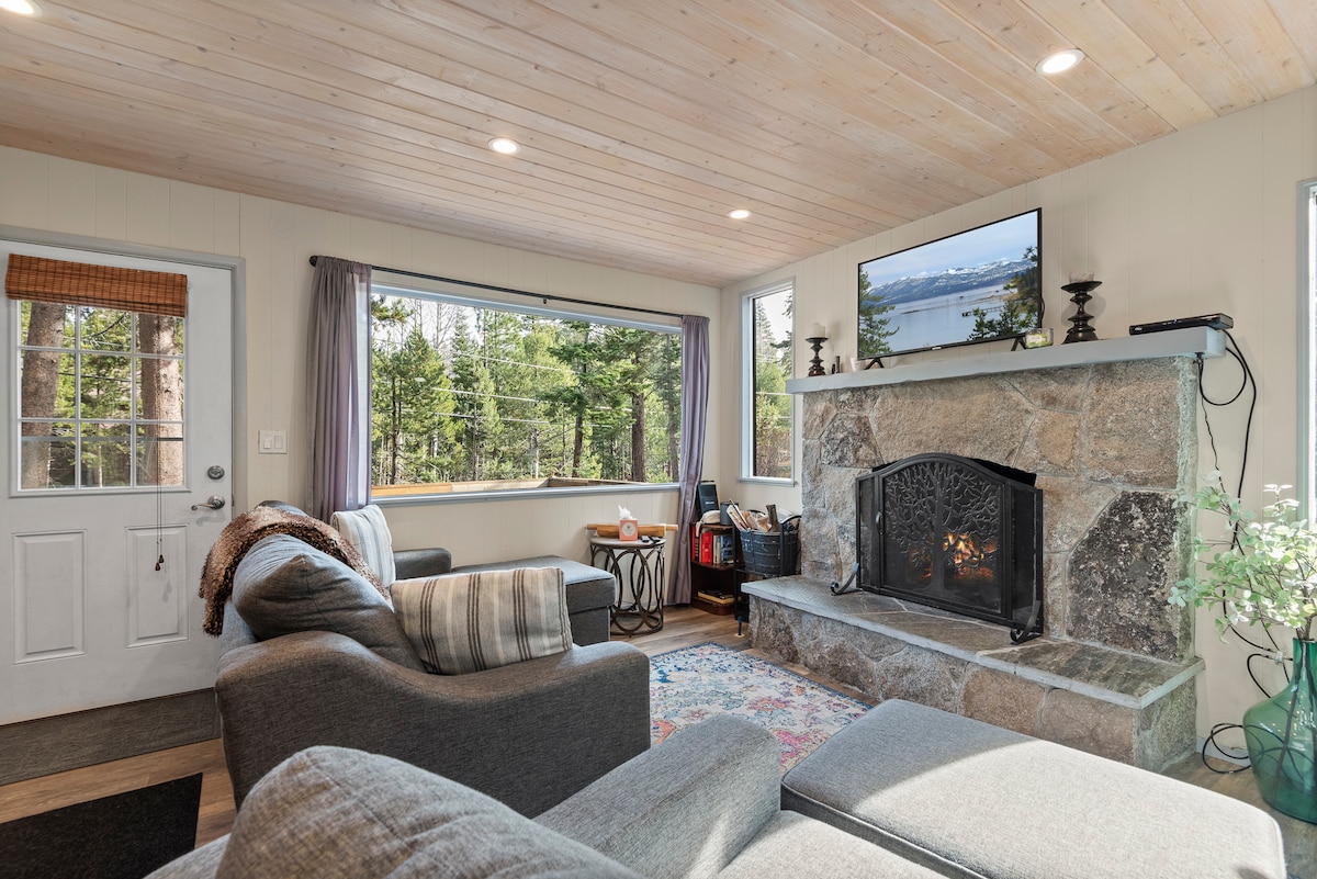 Our 2BD/2BA welcoming home sleeps 5-7 people (3 or 4 adults + kids is optimal). The living room, dining nook & kitchen are an open floor plan, allowing for gatherings and making memories. The kitchen is stocked with essential cooking equipment. On the front deck we have a gas BBQ, deck chairs and an outdoor table. If you need to warm up, we have a wood-burning fireplace in living room. The snow/mudroom has a washer & dryer & space to store snow/beach items. VHR21-0050 IG @tahoebigpinecabin