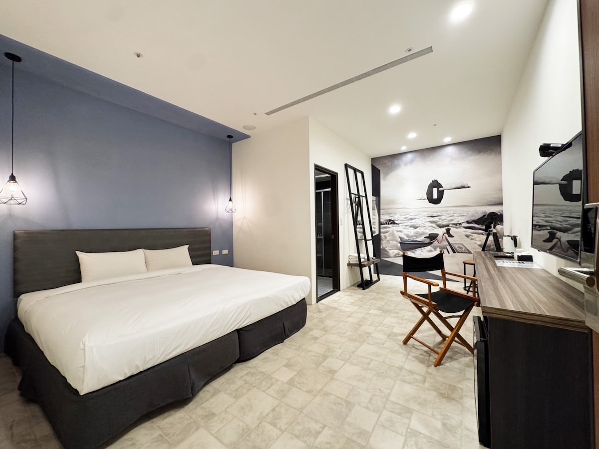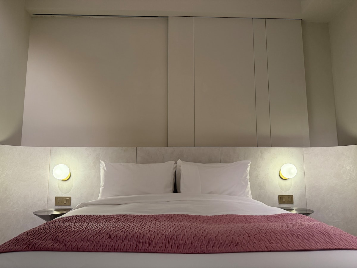 台中北屯包豪斯風格寵物友善旅店,豪華雙人房提供情侶浪漫住宿空間,歡迎攜帶毛孩入住享受舒適時光。