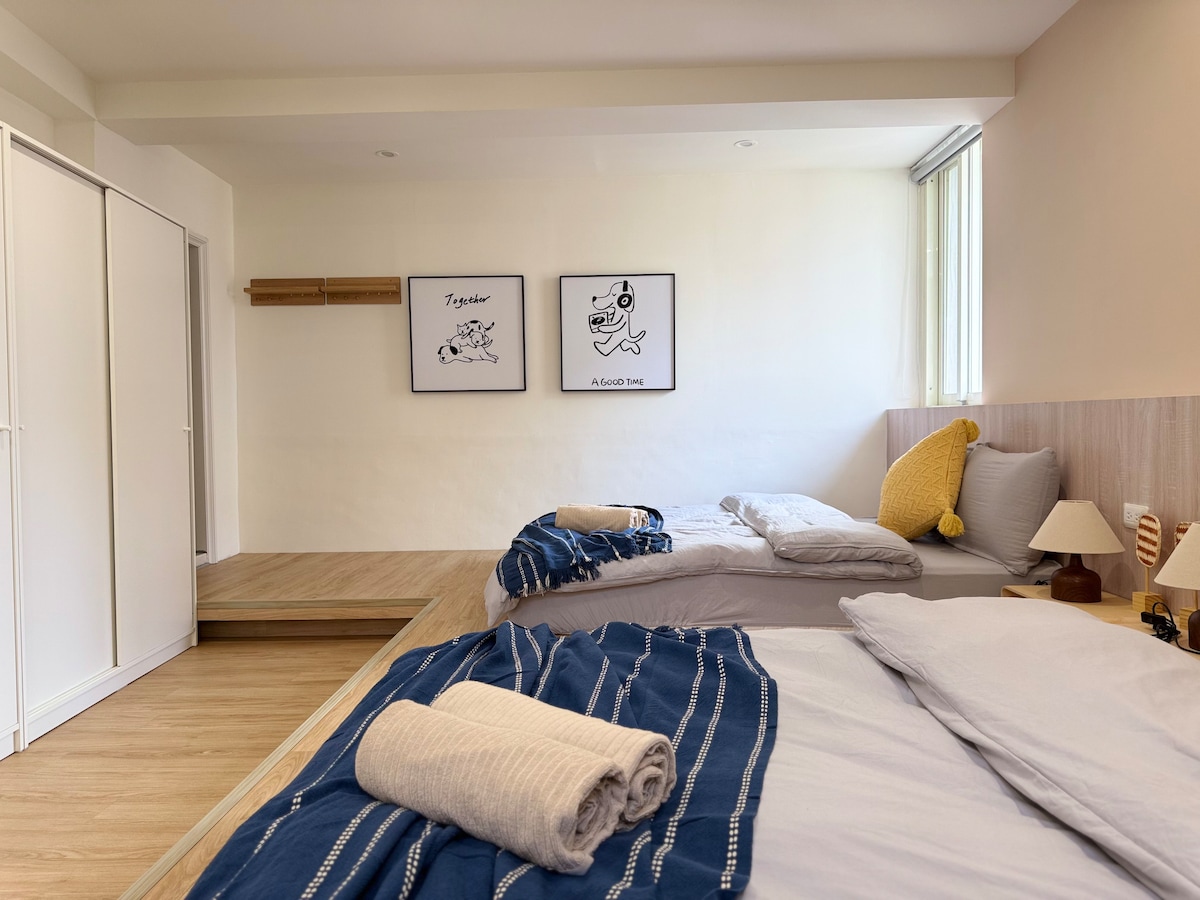 2pm 寓所鄰近西屯區最熱鬧逢甲商圈,鬧中取靜,方便停車,附近有楓康超市、7-11、全家便利超商、以及傳統早市。 房間有舒適沙發的客廳區及廚房餐廳,我們提供火鍋湯底及所有餐具,讓外地旅客可以感受在外也可以與家人朋友圍爐吃火鍋的氣氛。 睡晚了也沒關係,2pm寓所,就是讓旅客2pm再退房。睡飽有精神再出發吧! 因應個人衛生,整個床單套組會使用一次性床單被套,雖然看起來不像飯店床單 優雅,但會在入住前才拆封,絕對沒有其他人用過。入住前會全面消毒,沙發及床組都會使用除蟎機。請安心入住。