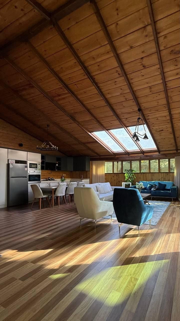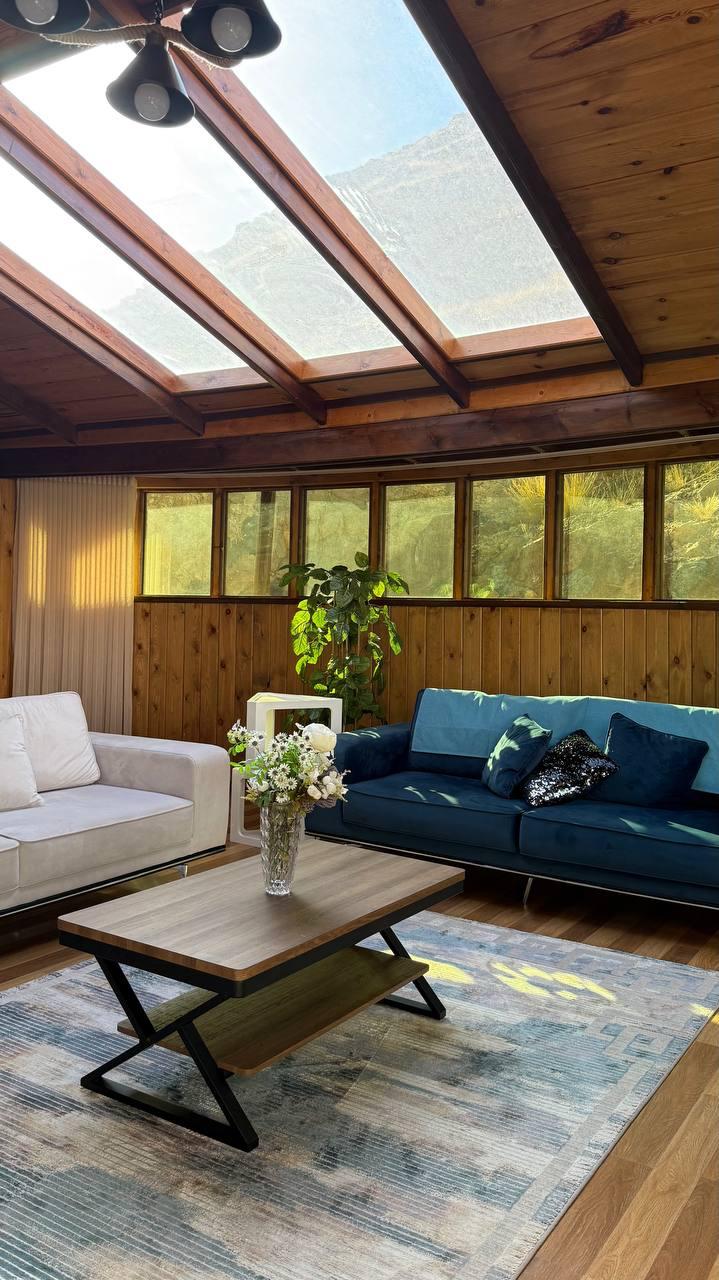 كوخ خشبي دافئ مبني على طراز ريفي أنيق، محاط بأشجار صنوبر طويلة تمنحه عزلة هادئة وخصوصية عالية. عند الدخول، تستقبلك غرفة معيشة واسعة بلمسات خشبية طبيعية ونوافذ كبيرة تسمح بدخول ضوء الشمس وتطل على منظر طبيعي مريح للعين. توجد أريكة مريحة تتسع للجميع مع مدفأة حجرية تمنح المكان جواً حميمياً في المساء يوجد مطبخ مجهز بالكامل بطابع ريفي بسيط، مع طاولة خشبية صغيرة لتناول الوجبات. كما يحتوي الكوخ على تراس خارجي مزوّد بطاولة جلوس وإضاءة خافتة، مثالي لاحتساء القهوة صباحاً أو الاسترخاء تحت النجوم ليلاً.