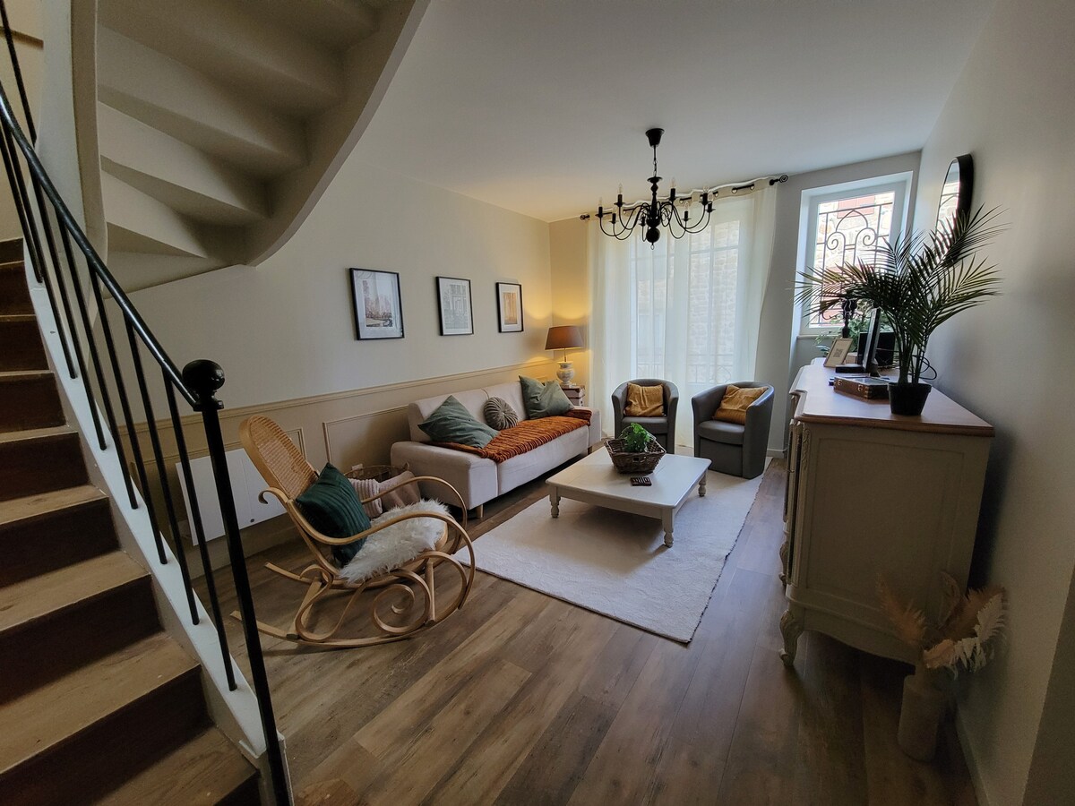 Profitez d'un logement élégant et central. Au calme, à deux pas de la gare et du centre ville. Proche des commerces, Marques Avenue et du centre historique. Ancien atelier de menuiserie entièrement rénové avec terrasse agréable. Cuisine équipée, smart TV, wifi, clim réversible, 1 chambre en mezzanine avec un lit double + 2 lits simples pouvant être transformés en lit double. Salle de douche avec douche à l'italienne. 1 wc à chaque niveau.