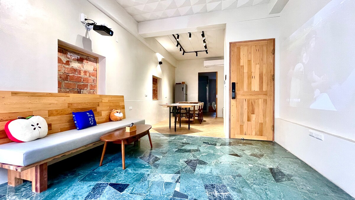 位於台南市區,一間屋齡40年、由祖父傳承的老宅,有獨特的「綠色大理石拼接」地坪。 1F : 室內車庫(限停機車)+ 共用空間。 2F : 一間雙人套房 + 客廳 + 廚房。 3F : 一間雙人套房 + 戶外露台。 |拾光碎影。設備用品| 投影機、麻將桌(手搓)、飲水機、冰箱、電磁爐、咖啡機、基本餐具、餐桌、冷暖空調。 浴室暖風機、毛巾、浴巾、室內拖鞋、浴缸(僅3F提供)
