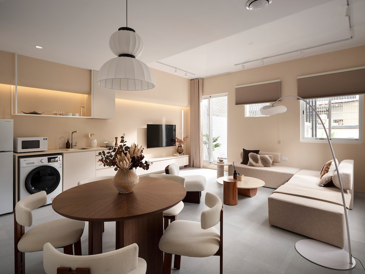 室內的灰白主色,配搭北美木紋銅色傢俱及家飾, 用心為您的居住空間提供沈靜優雅的感覺。日韓系電器的選用,不論是無線充電藍牙喇叭,大螢幕伸縮高清電視,都能滿足您對影音效果的要求。房源位於高樓內縮樓層,阻絕不必要的噪音並滿足您對景觀,安靜及隱私的要求。大樓並配有全天候警衛,住戶專屬電梯,公用大露台,以及地下收費停車場, 位處西門町核心路段,無論搭乘捷運或自駕都非常方便。Earth tone- based interior design offers warming, calm, healing and delighted atmosphere. Room facilities, including double bed, en- suite bathroom with shower enclosure, air conditioning, smart 4K TV with movies/Netflix, WIFI internet, cove lighting and music player with wireless connection & USB charger ports.