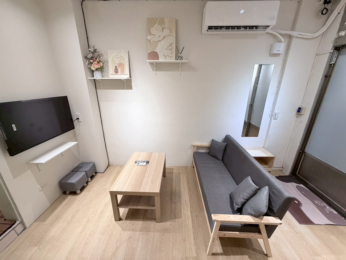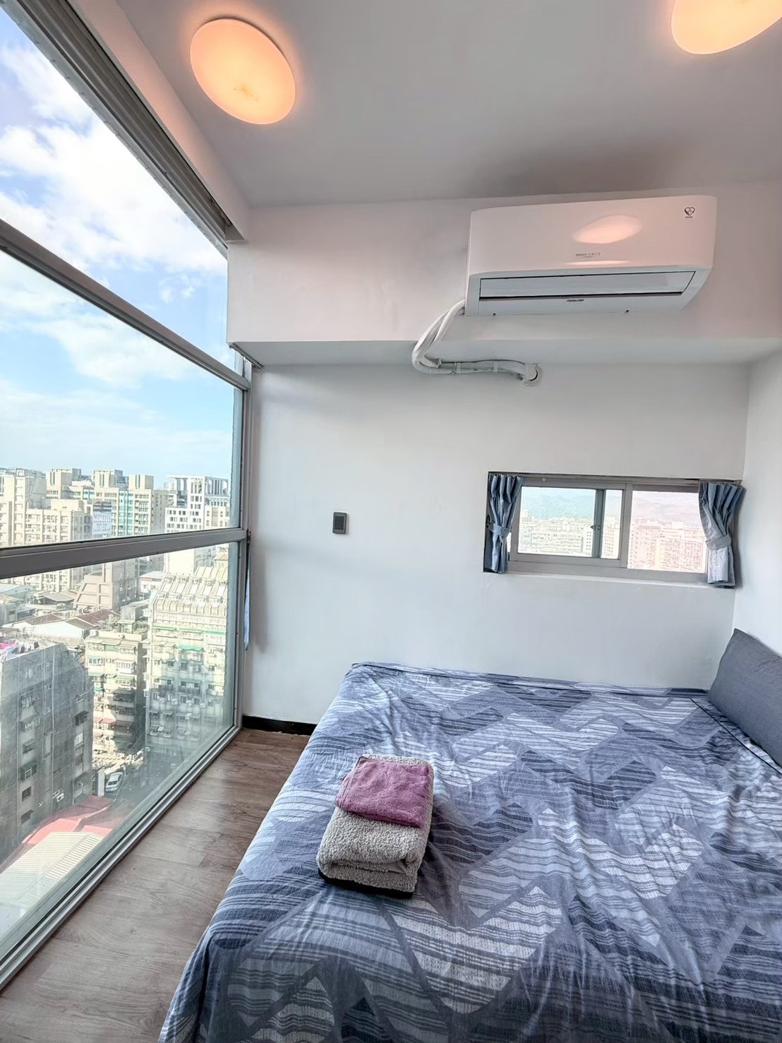 室內的灰白主色,配搭北美木紋銅色傢俱及家飾, 用心為您的居住空間提供沈靜優雅的感覺。日韓系電器的選用,不論是無線充電藍牙喇叭,大螢幕伸縮高清電視,都能滿足您對影音效果的要求。房源位於高樓內縮樓層,阻絕不必要的噪音並滿足您對景觀,安靜及隱私的要求。大樓並配有全天候警衛,住戶專屬電梯,公用大露台,以及地下收費停車場, 位處西門町核心路段,無論搭乘捷運或自駕都非常方便。Earth tone- based interior design offers warming, calm, healing and delighted atmosphere. Room facilities, including double bed, en- suite bathroom with shower enclosure, air conditioning, smart 4K TV with movies/Netflix, WIFI internet, cove lighting and music player with wireless connection & USB charger ports.