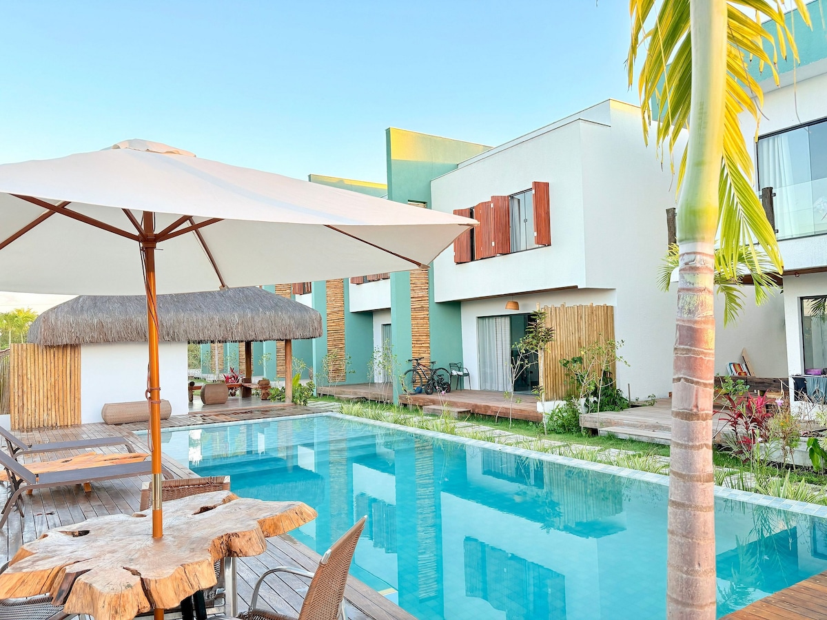 Vá andando para a praia todos os dias. 80 metros das Piscinas Naturais de Taipús De Fora. Ambiente tranquilo, cheio de estilo e com excelente estrutura de apoio à sua estadia. Serviço de camareira diário incluso. 5 lindos Bungalows recém construídos, tudo novinho e próximo a bons restaurantes, mercados, padarias, farmácias etc.. Descanse na rede ou na piscina com hidromassagem, sentindo a brisa e o barulho do mar. Sejam muito bem-vindos a este Paraíso.