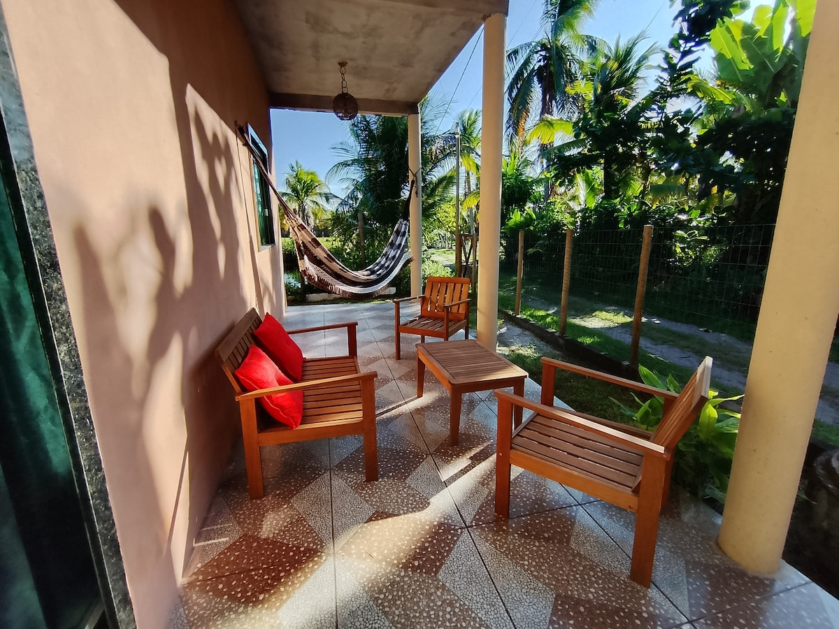 Nosso cantinho é simples, mas confortável. Um quintal amplo cheio de Árvores e uma rede em baixo do Pé de Cajú pra o cochilo da tarde. Uma varandinha com sofá, cozinha equipada. Um quarto espaçoso com 1 cama de casal e 1 colchão de solteiro. Banheiro com chuveiro quente. E mais um pequeno quintal no fundo com vista pra "floresta". Eu (seu anfitrião) estarei sempre a disposição de qualquer necessidade. Minha casa, sua casa! Seja bem vindo(a)!