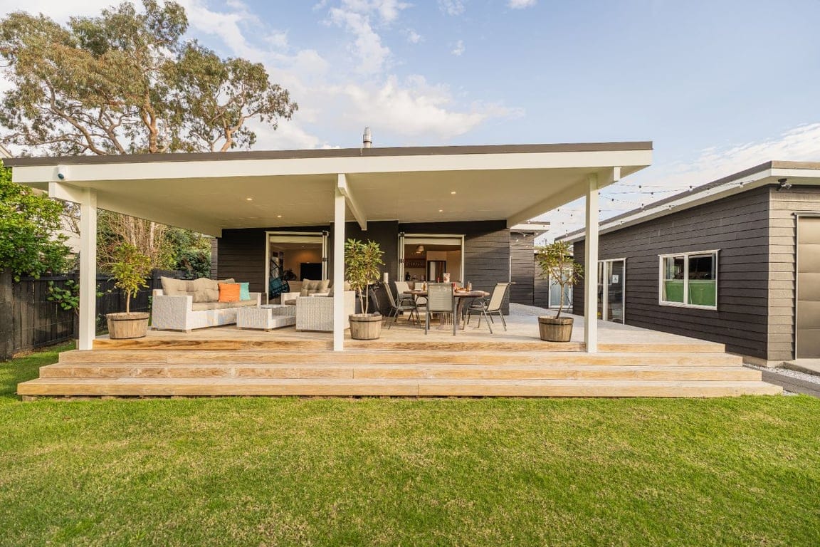 Give yourself a beach holiday like no other. An elevated site, nestled in the trees. You will wake to bird song and a full unobscured view of the beach. The property features 3 rooms with beach views, a very large open living area and expansive deck perfect for a BBQ. The house is naturally sheltered from the predominant westerly wind meaning you can make the most of the outdoor space. The beach is only a 5 minute walk away and the stream provides safe swimming areas for children.