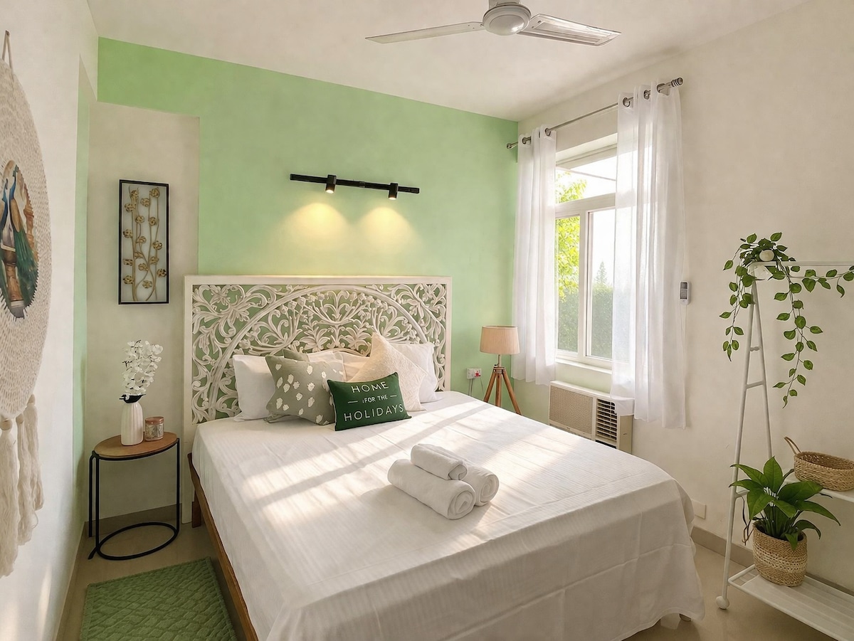 Welcome to Maskaa, a stylish 2BHK apartment with a warm bohemian vibe, thoughtfully designed for comfort and relaxation. Perfect for families or small groups, the space comfortably accommodates up to 6 guests, with two cozy bedrooms and an additional queen-size bed in the living room. Enjoy a spacious, beautifully curated home with a relaxed artistic feel, modern amenities, and a peaceful residential setting—ideal for unwinding after a day out.
