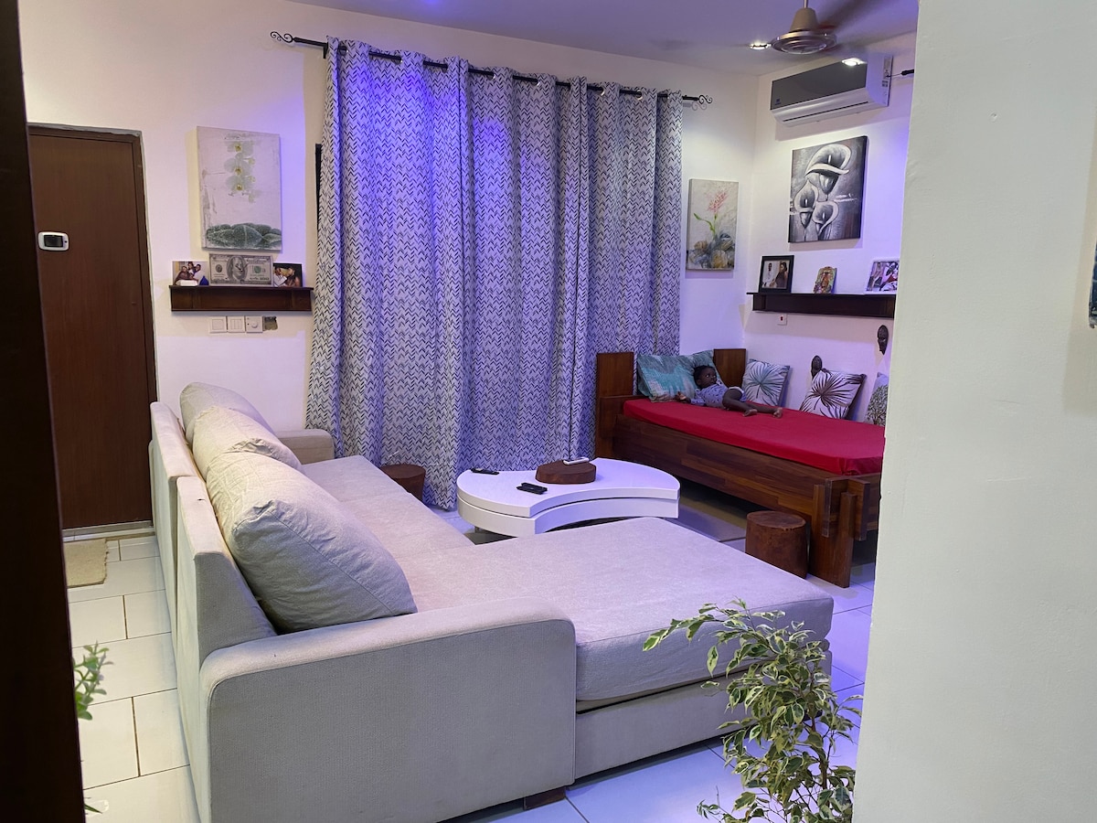 lovely one bedroom fit for a queen and King. very spacious upstairs unit in a very upmarket safe and secured area .The compound has an ample parking space ,swimming pool,nice balcony, fitted bar and lovely entertainment area .The unit offers privacy with it own kitchen,double door fridge /freezer combo,living area with luxurious leather couch for entertaining friends be it for dinner or catching a movie. long and short term stay available . DON'T MISS OUT A GREAT HOSPITALITY IN MODERATE PRICE