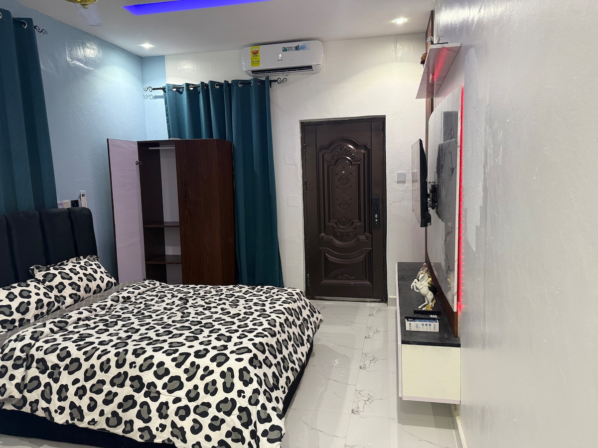 This central unit suits solo travellers and business or leisure stays. You get a private bathroom, mini fridge, and microwave for your takeouts. It’s a short walk to the airport, VIP, STC, restaurants, shops, event centres, and nightlife. You don’t share amenities, so you enjoy a cosy, private feel in the heart of Takoradi. This gives you a cosy homey vibe rather than a hotel. 😉