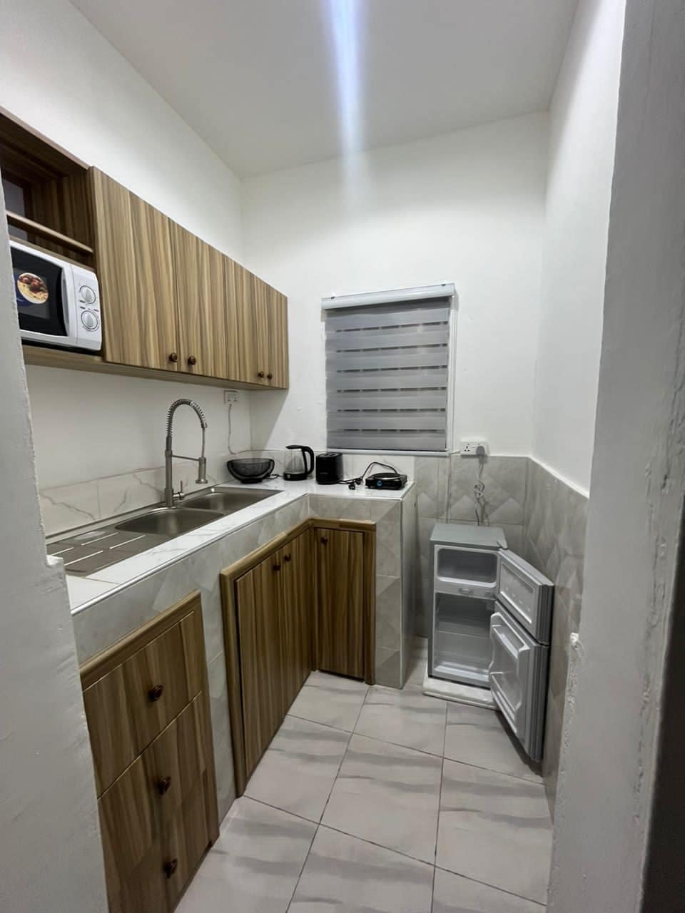 An en suite bedroom with living room,very spacious. You have bed and mattress in the bedroom and an air conditioner.The living room comes with a sofa set,center table,a wall mounted Tv.The living room has a fitted mini kitchen just as studio set-up and using hot plate cooker. The living room comes with an air conditioner and a mini refrigerator.You have an out cooking area and a pool as well. Security is Top,24/7 security at post.You have a car park and just about 10 min drive to Airport.