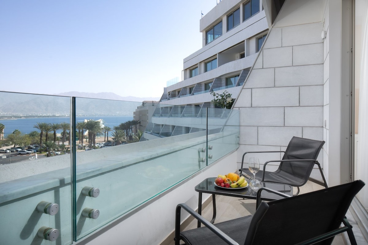 סוויטה 55 מטר מורכבת השני חדרים חדר שינה וסלון גדולה ומרווחת יש מטבחון מאובזר כולל תנור אפיה מיקרוגל וכירה יש פינת אוכל טלויזיה אחת בסלון ושניה בחדר שינה מורכבת מיטה זוגית + ספה שנפתחת למיטה זוגית +שני מיטות יחידי מתקפלות ונוחות מיקום מרכזי מול קניון המול והטיילת במתחם סיסייד אילת