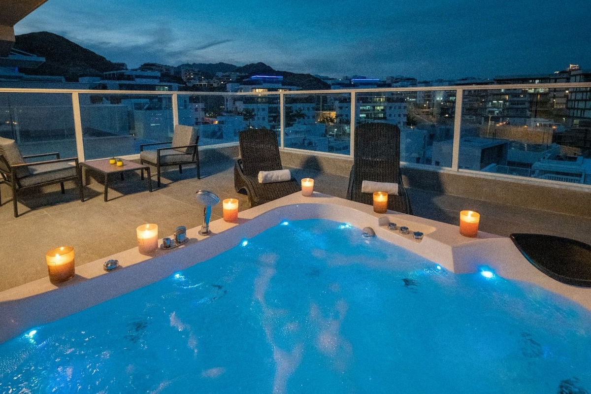 Imagine yourself surrounded by a view of mountains, sea and endless silence... suitable for you? You are invited to a unique and pampering vacation in a penthouse apartment designed and equipped at the highest level with a breathtaking view balcony that includes a heated pool, sitting areas, an arranged barbecue station and more.