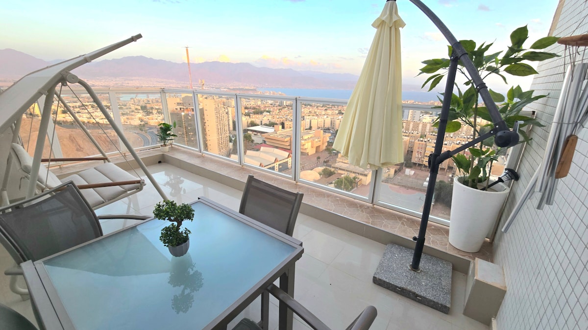 Amusez-vous avec toute la famille dans ce logement chic et chaleureux avec des terrasses magnifiés par la vue sur toute la baie d Eilat et la mer . Une grande piscine et salle de sport Dans la résidence agrémente le penthouse . L appartement est composé de façon où chacun a son intimité et son coin de terrasse pour lire ou s amuser dans le jacuzzi privatif Juste en bas de la maison il y a une synagogue et un supermarché génial parking privé . 2 Lit bébé . Salle de sport , mamad