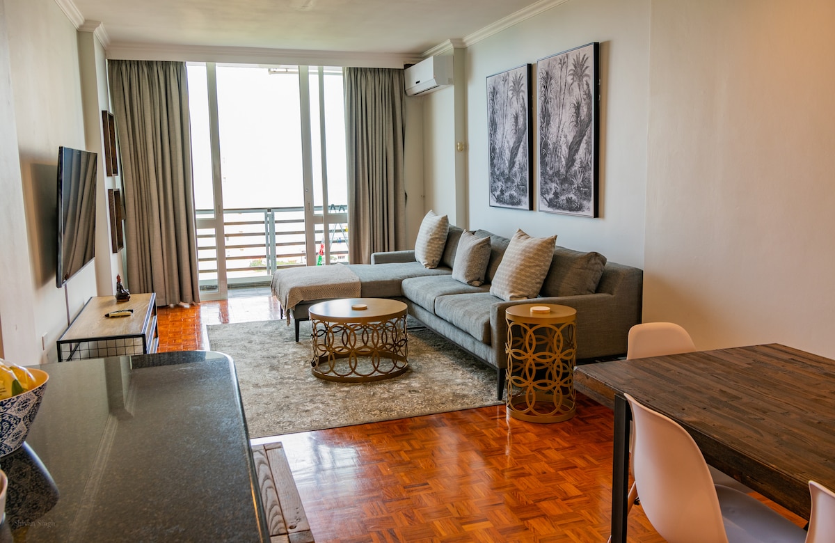 Kick back & relax in this calm, stylish airconed space surrounded by restaurants. Inverter for back up power so uninterrupted power. Panoramic sea views & harbor entrance view. Perfect for romantic or family getaway or business trip. 1 bedroom+sleeper couch. 5 min walk away from the promenade & beaches & restaurants. 2 min drive to Ushaka. Active promenade. Surfing,supping avail for the canals & ocean nearby. Glorious sunrises over the ocean.Safe block of flats/area, 24/7 security. Safe parking.