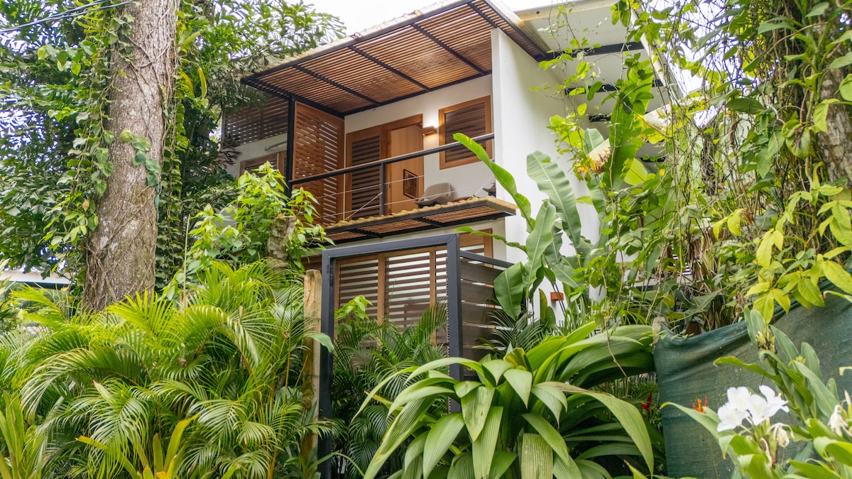 Welcome to your modern tropical hideaway —a newly built private studio home just steps from the golden sands of Cocles Beach and walking distance to the very best restaurants and grocery stores in town. Surrounded by towering trees and tropical gardens, watch toucans, sloths, blue morpho butterflies, and even the occasional Agouti—right from your patio. It’s not a tour, it’s your private piece of paradise.