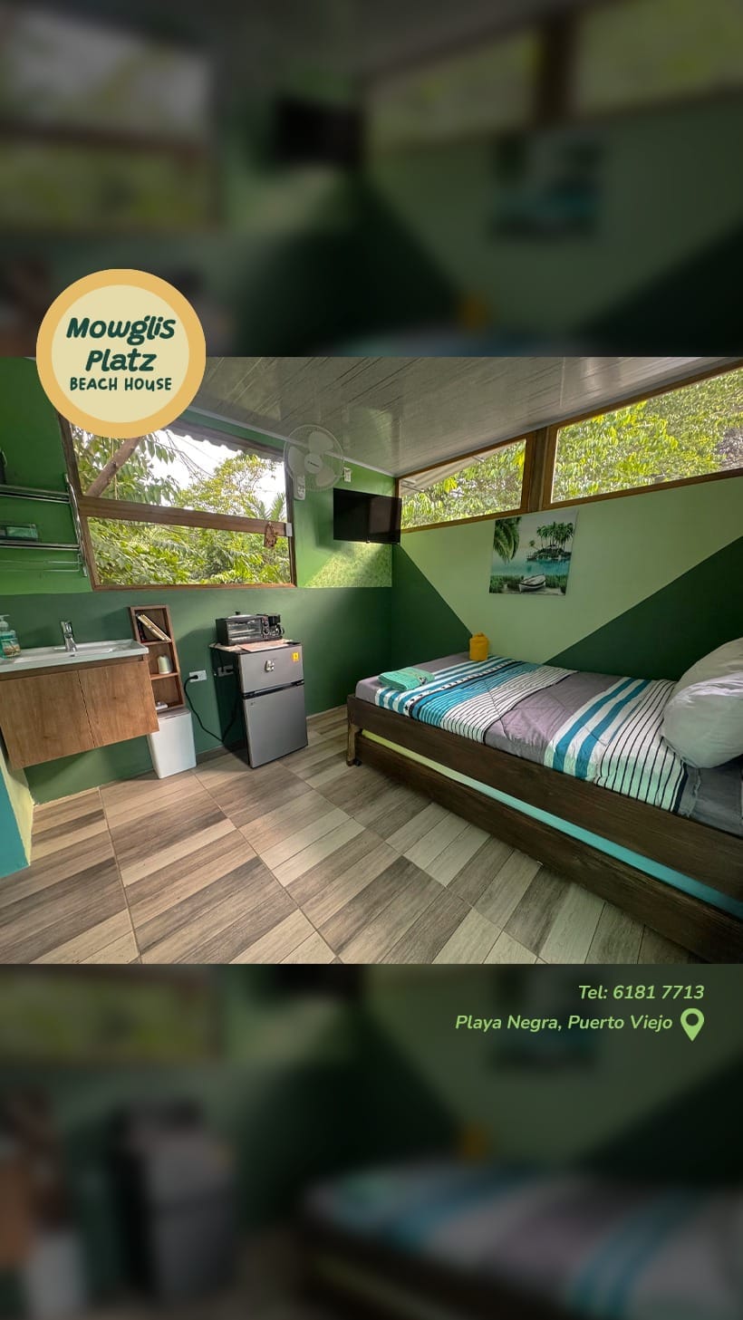 Part of the Playa Negra Guesthouse, right in front of the Black beach of Cahuita. The Green Cottage is a loft with fully equipped kitchen,Air conditioned, Netliix, very private balcony where you can fall asleep with the sound of the ocean. Very nice garden for bird watching, pool, bbq, various animals on the property. The Cottage have WIFI, ceilling fan, safety box, beach towels, maid service every day and more...