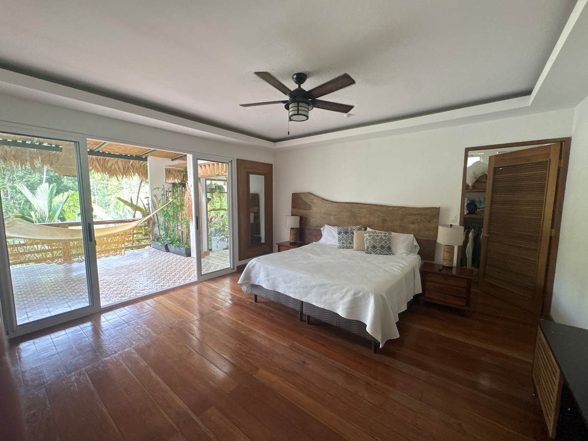 Escape the bustling town at Los Nidos Tropicales! A cozy retreat for up to 5 guests, featuring 2 bedrooms and 1 bathroom with air conditioning in each bedroom. Enjoy your morning on the open porch and observe nature. You will have privacy in our lush garden, perfect for families with children but also birdwatchers. Only a 5 min walk to the beach and 7 min walk to the little supermarket next to the hotel Banana Azul. Enjoy dinner at Soda Mirna closeby. 10min by car to center of Puerto Viejo.