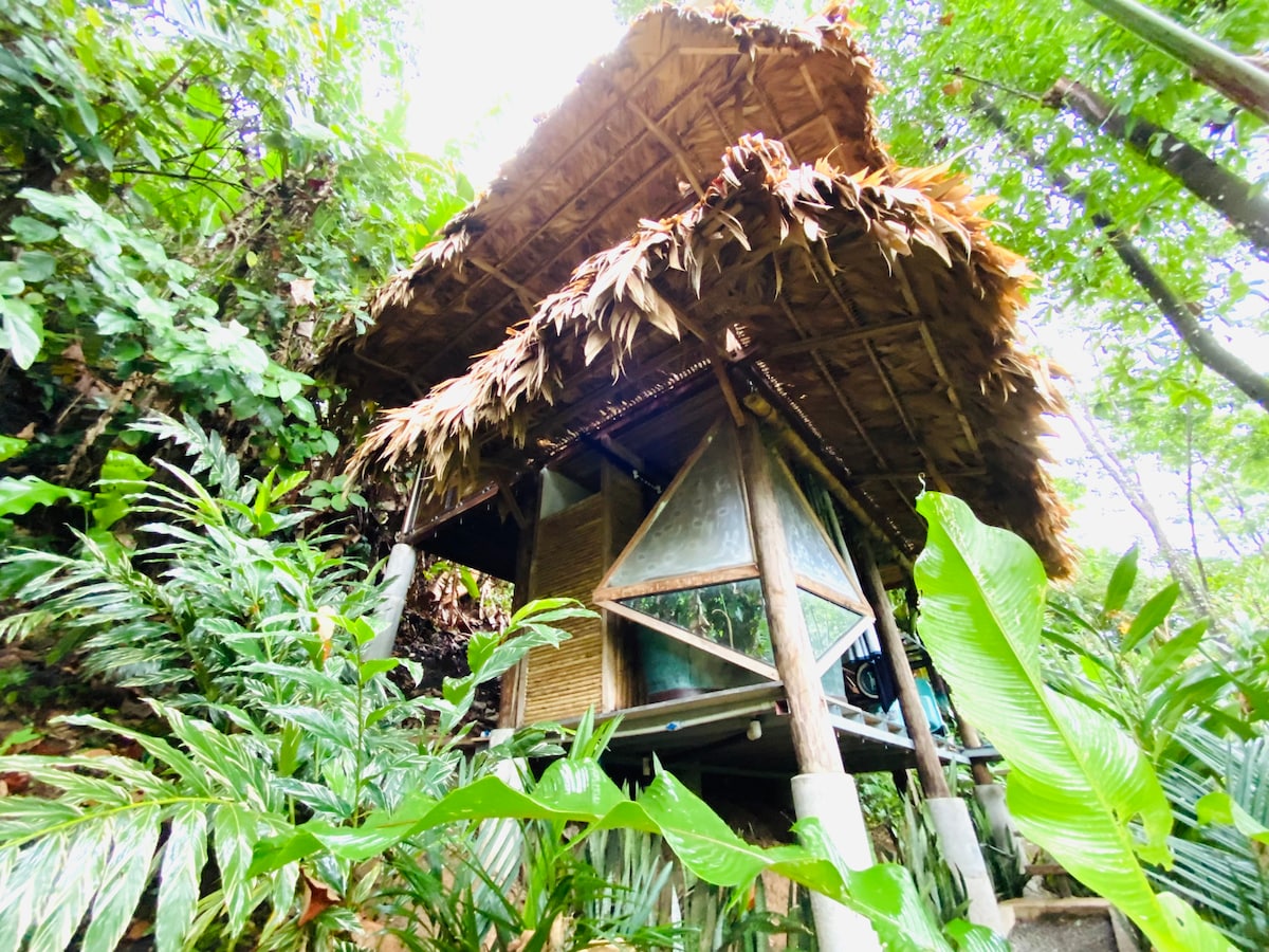 Casa nido Is situated in a lush tropical farm establish 20 years ago .This house is the perfect get away ,built completely with sustainable materials bambú and wood it offers the jungle experience with a small fully furnished kitchen wth windows overlooking the flight of toucans , a double bed,charming dinning area , shower and two terraces offer ample sights of tranquility. Note the house is up hill ,10min walk to the house from the entrance where there is secure parking area.