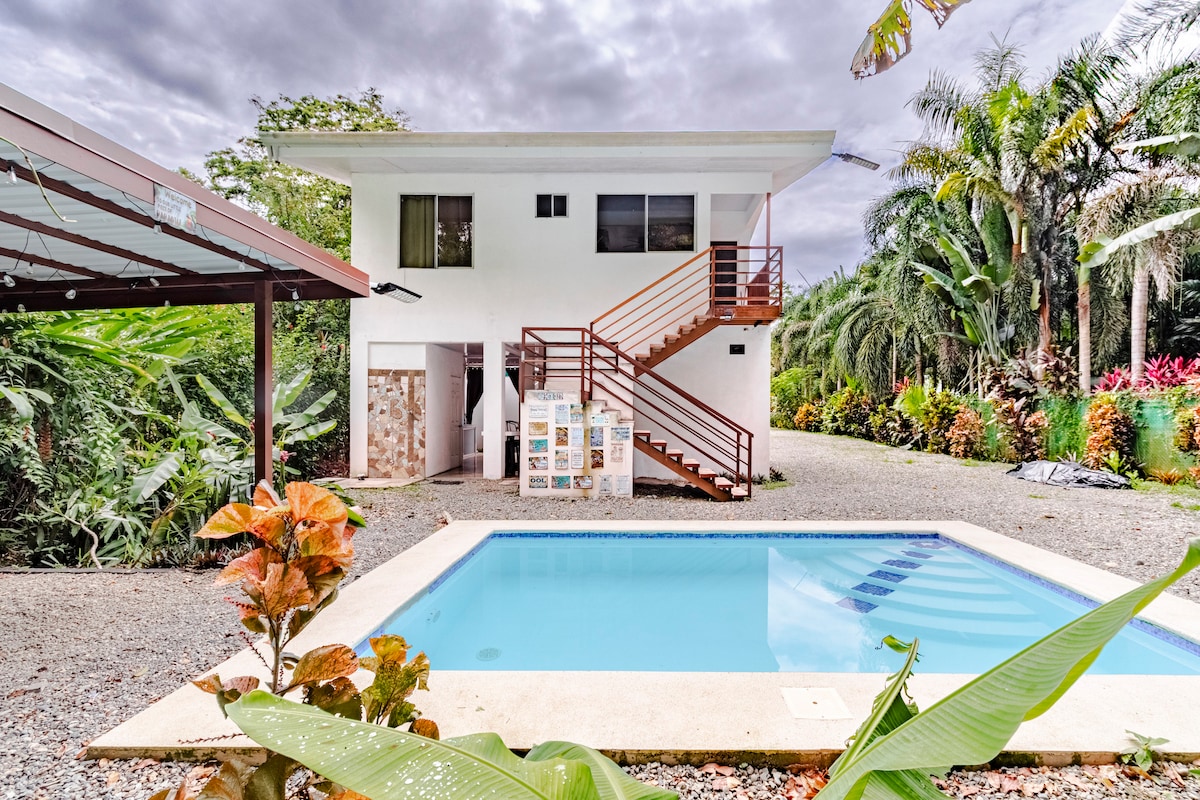 Brand new house with pool,4 bedrooms with A/C,huge tropical garden in a very quiet area only 300m from the National Park Cahuita with the white sand beach Casa Los Angeles offers ideal accommodation for families/groups of friends wishing to discover the Caribbean coast The master bedroom has a queen bed overlooking the pool area with a private bathroom and A/C A share bathroom with hot water is available for the other bedrooms also with A/C Kitchen equipped and a Rancho with bbq and fridge