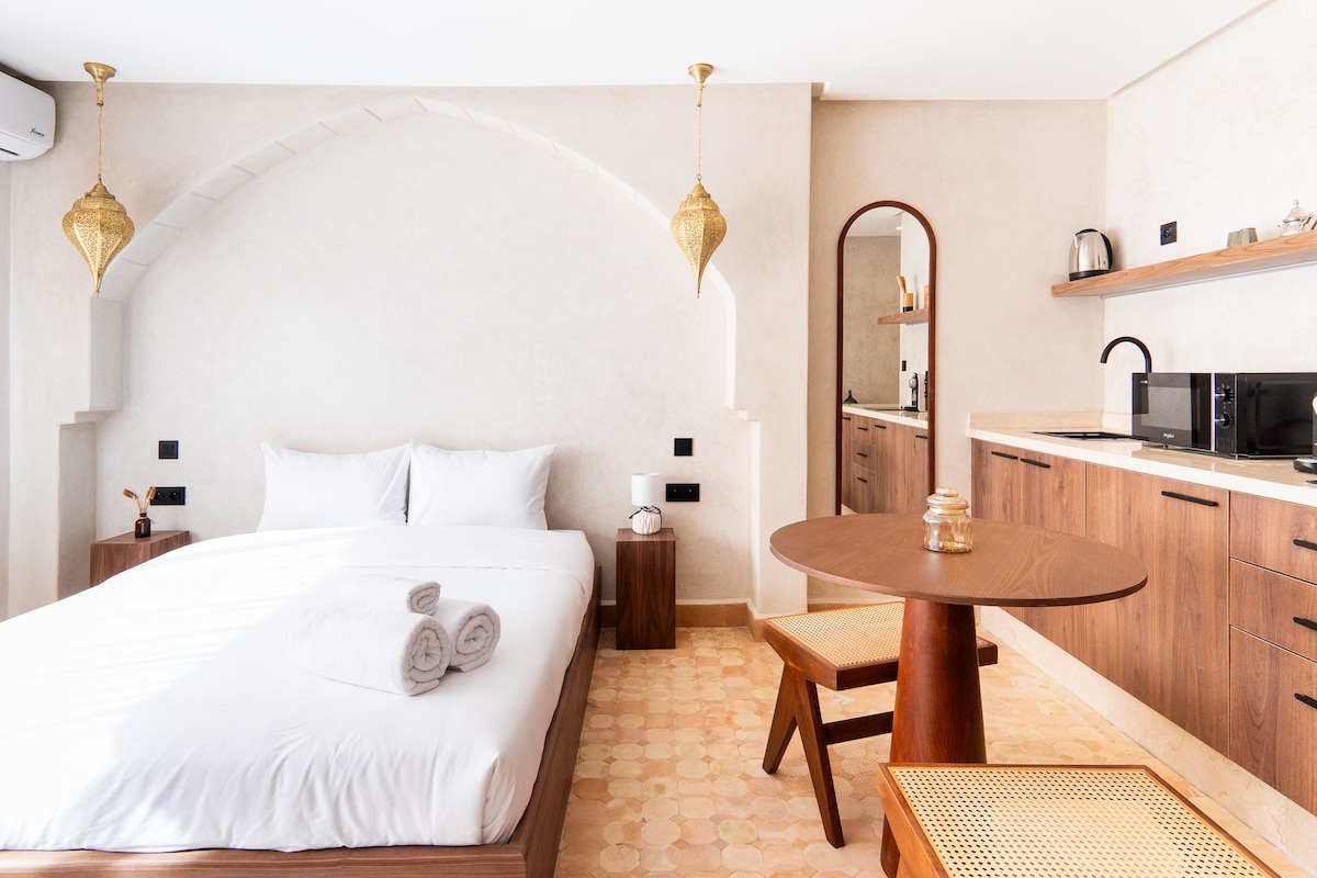 Séjournez en plein cœur de Marrakech dans notre appartement 2 chambres et 2 salles de bain. Profitez d'une literie Simmons haut de gamme, WiFi haut débit (fibre optique) et d'une décoration moderne avec une touche ethnique. Cuisine entièrement équipée, baignoire élégante, et douche italienne. À quelques pas de la place Jemaa el-Fna, du Plazza, et du Carré Eden. NB : Les couples marocains non mariés ne sont pas autorisés.