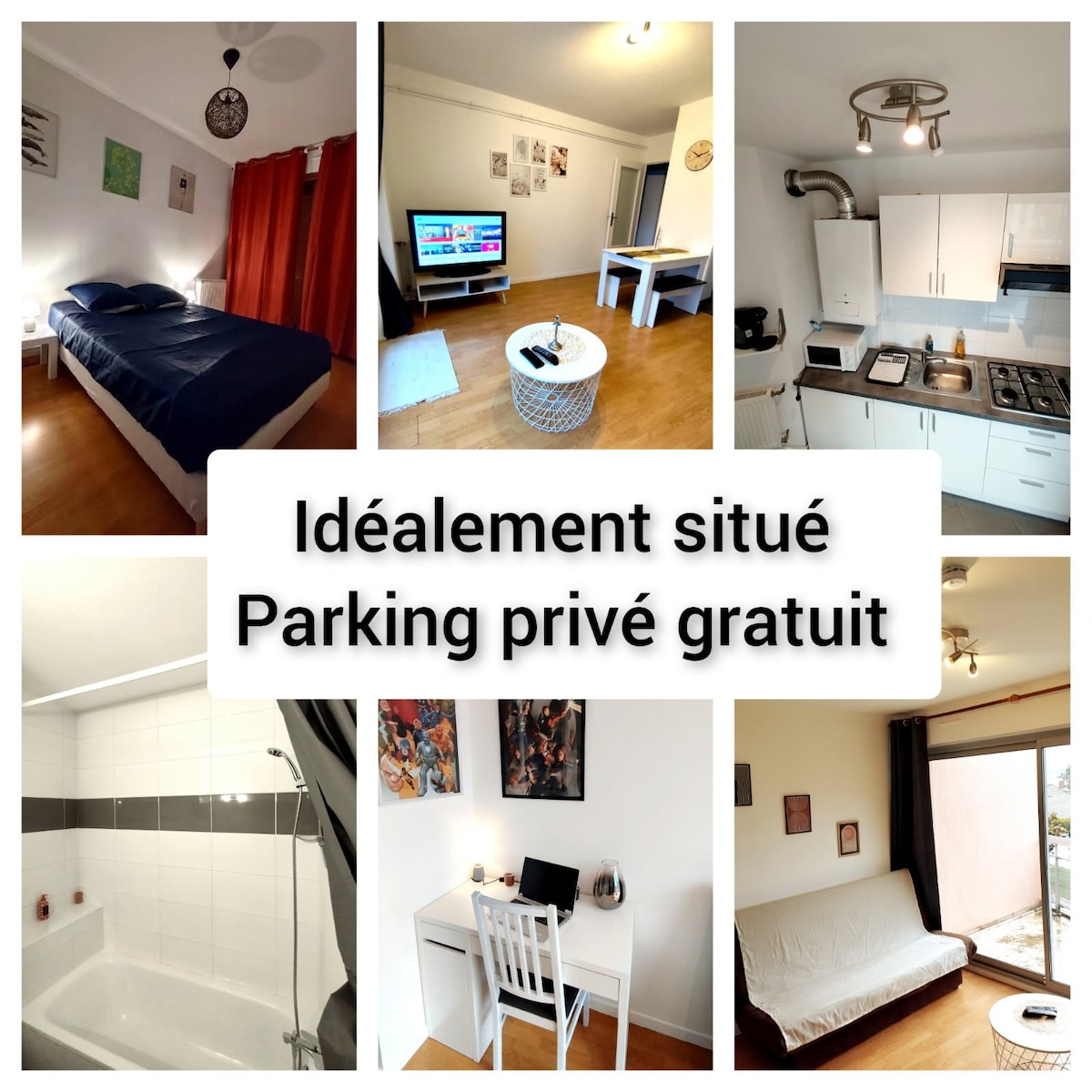 Studio au fond de notre jardin : coin cuisine, coin nuit, un grand dressing et une sdb (grande douche/wc). Attention pas de boite à clé (voir fourchette horaire dans règlement intérieur) et pas de télé (mais bon Wi-Fi 😉). L'environnement est très calme en dehors des passages de train (parfois nombreux la nuit). Stationnement gratuit dans la rue.