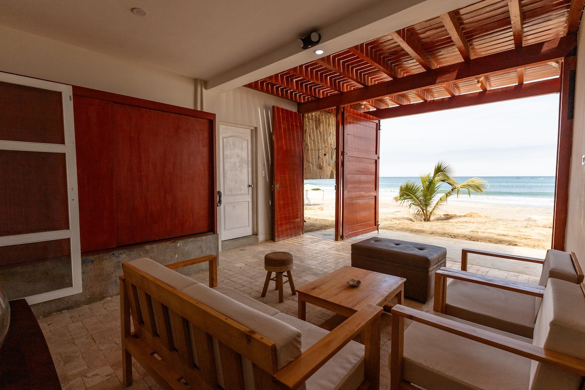Cozy Suite at ocean shore right at the beach Las Pocitas, with private access to the beach, the most exclusive area in Mancora. 50 m2 suite, own private space with beautiful palms and gardens, plenty of places to relax. Suite with a king size bed, big flat tv, optic fiber internet, fan, a little kitchenette station( coffee machine / sandwich grill and minibar ), big terrace, with stunning views to the ocean, and sun-loungers at your beach. Restaurant and pool in the property right next to us.
