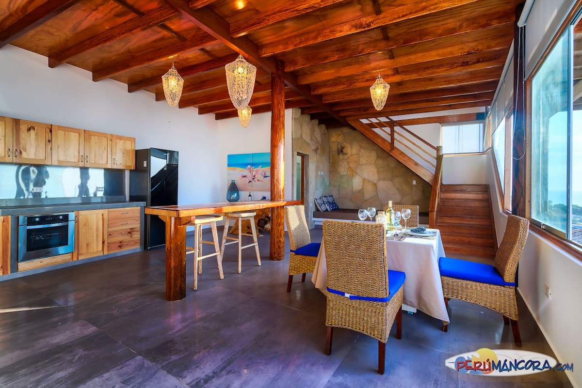 Cozy Suite at ocean shore right at the beach Las Pocitas, with private access to the beach, the most exclusive area in Mancora. 50 m2 suite, own private space with beautiful palms and gardens, plenty of places to relax. Suite with a king size bed, big flat tv, optic fiber internet, fan, a little kitchenette station( coffee machine / sandwich grill and minibar ), big terrace, with stunning views to the ocean, and sun-loungers at your beach.