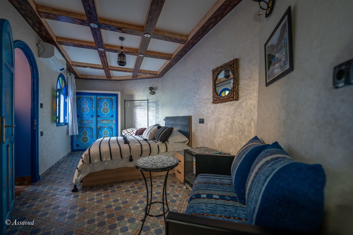 Artisan home in Hay Andalous (old medina). A cosy home in 400 year old historical building with private entrance, spacious living room with panoramic view of Chefchaouen. Access to private roof for 360° view of the town and the mountains. Easily accessible with car/taxi since the house is located next to one of the old city gates (Bab Mahrouk) with a public parking space. Lots of love put into the details with hand-painted ceiling, hand-made zellij and traditional blue walls (Chefchaouen-style).