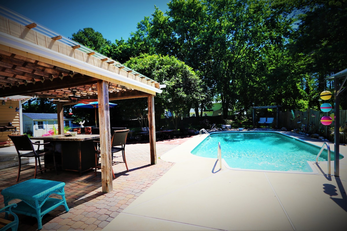 From January, 2026 through March, 2026 come 3 nights and you get 4th free! Casey's Porch is the place to go. Come and see for yourself. Bring your extended Family. Bring your friends. Enjoy the pool. Kayaks and paddle boards and bikes await you at this beautiful home on Hudson Creek. Fish from the dock. Pull crabs from the creek. Walk down quiet country lanes. Sit around the fire pit. So many fun, outdoor things to do. Casey's Porch has it all. T