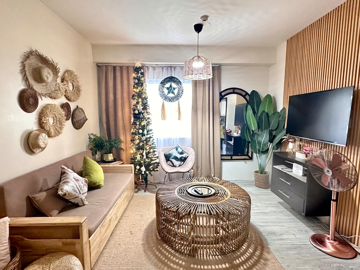 Welcome to a modern nordic design unit located at the roof deck w/ stunning view of mountains. This minimalist place is a perfect place to kick back, relax and enjoy a staycation like no other. Location is very accesible, the building is located along the road of Sta. Rosa - Tagaytay. If you decide to stay home, just lay down and turn on the TV all day long. You can also leave the windows open and sleep through the night with such cool breeze.