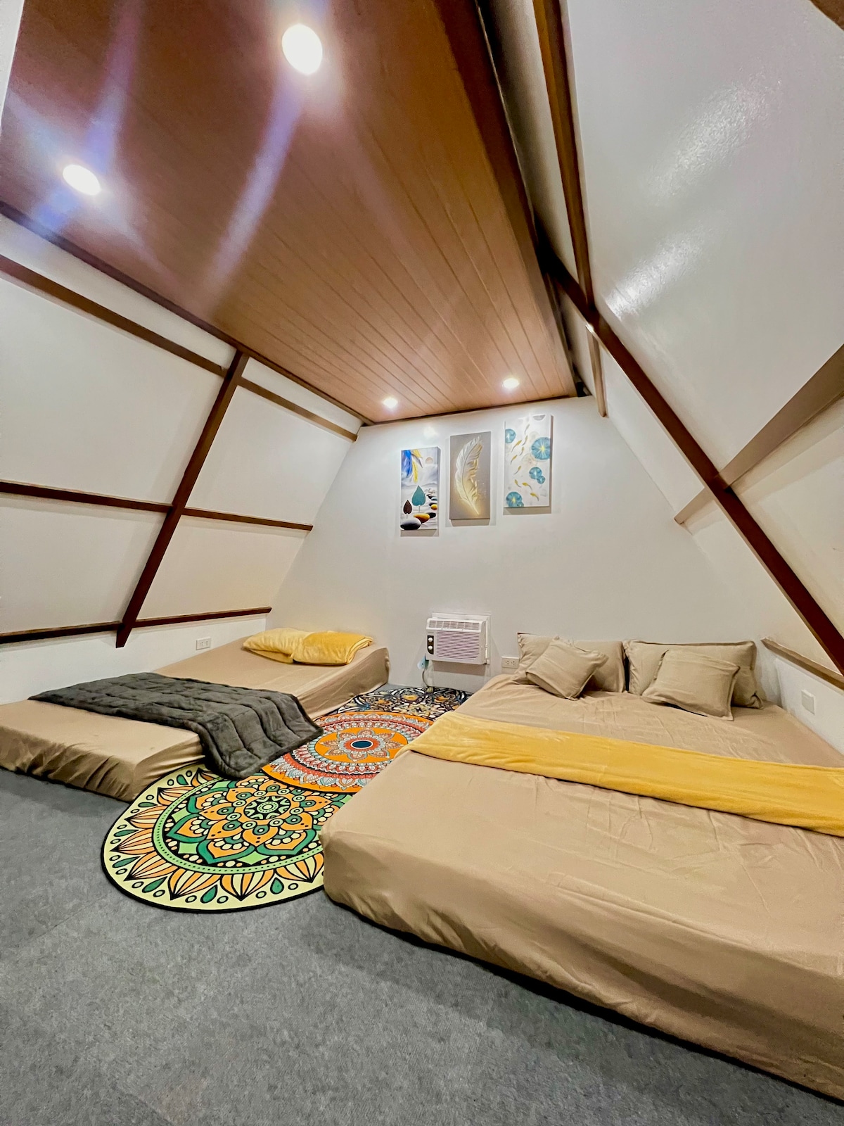 Relax in a logcabin-inspired duplex unit with 2 actual bedrooms and a spacious attic converted into a 3rd bedroom. It is a family home with fast internet, Cable TV, landline, air conditioned bedrooms, heated showers, full kitchen, Netflix, and open parking for 2. It is perfect for families who want a safe and quiet place to bond in. There is no Taal view from here, but the neighborhood is beautiful, lined with pine trees.