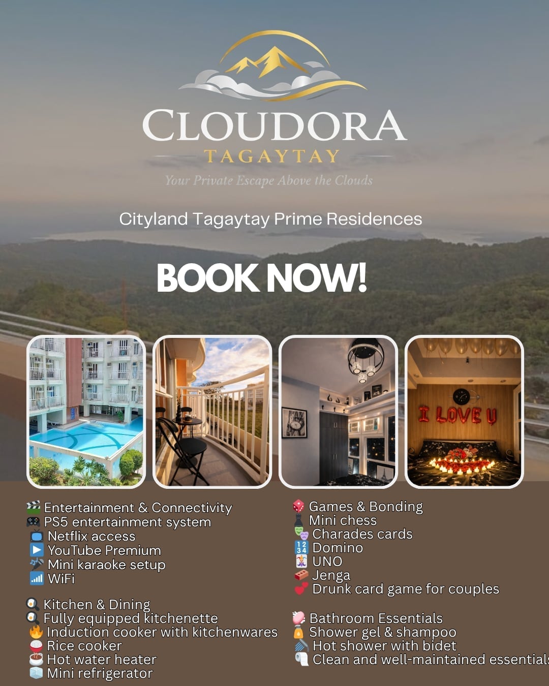 Welcome to The Overlook (formerly The Lake Escape), a refreshed and modern 2BR/2TB retreat designed for relaxation and connection. Enjoy Taal views from the master bedroom and living area, along with Wi-Fi, Netflix, and a sleek kitchen for light meals. Just 1 hr 15 mins from NAIA and mins. from top attractions, this serene space offers an elevated staycation experience where comfort, calm, and style come together. A short walk-through video of the space and views is available upon request.
