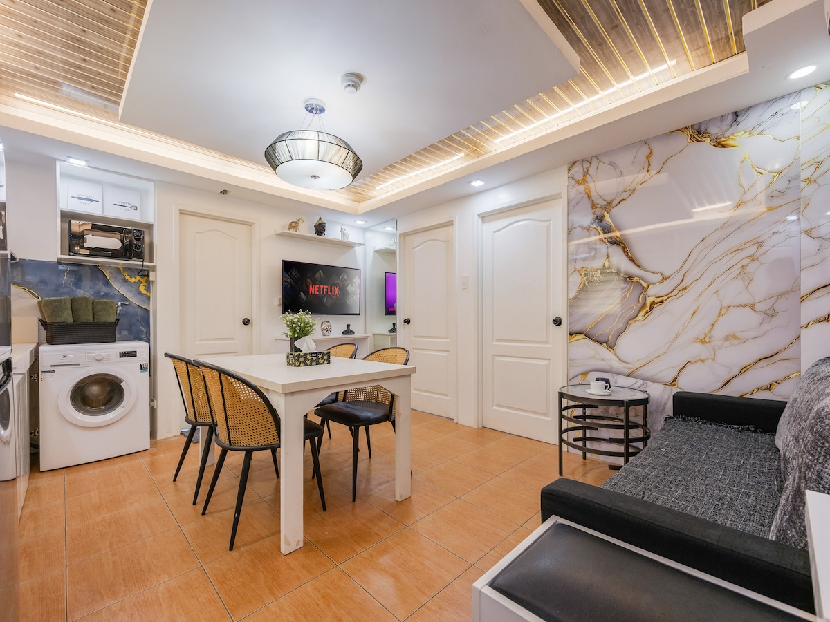 Enjoy a stylish experience at this centrally located place. Relax in this entirely cozy, modern and vibrant condo unit that is conveniently located near Mactan International Airport. Where it is close to everything like restaurants, coffee shops, laundry shops, malls and supermarket. - 3-5 minutes away from Mactan Airport - High-Speed Internet up to 200 Mbps - 65 inches TV with free Netflix - 1 Bedroom w/ 1 queen-size bed & 1 Foldable double size bed - Washing Machine -Fully equipped kitchen