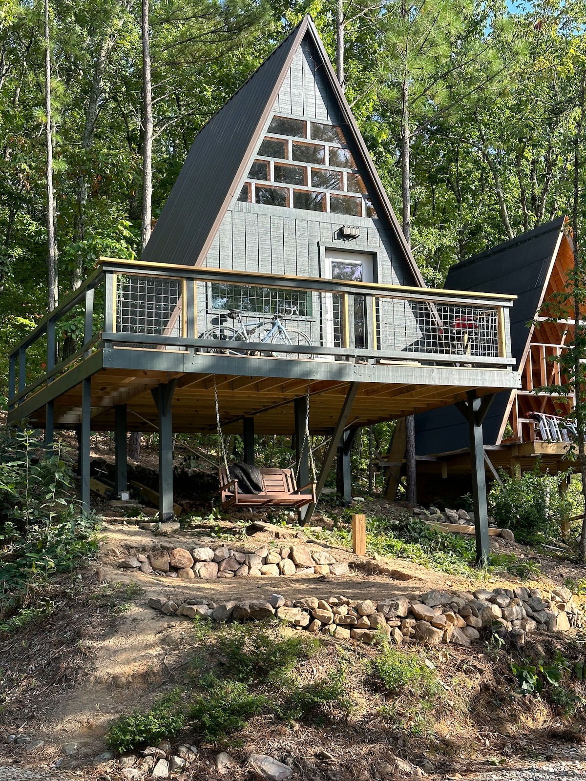 The TinyBarn at Covenant Woodlands is a lofted 350 sq ft glamping cottage in the piney woods of AL. Made with love from locally reclaimed upcycled materials. Equipped with modern appliances that fit the nostalgic cabin vibe: an electric wood burning stove and red retro kitchen appliances complimented by bear & moose accent decor. It’s cozy, but with everything you need for a getaway. Outside you’ll find rockers, a fire pit/outdoor dining area plus a hammock and bench. Insta: @CWglampingInAL