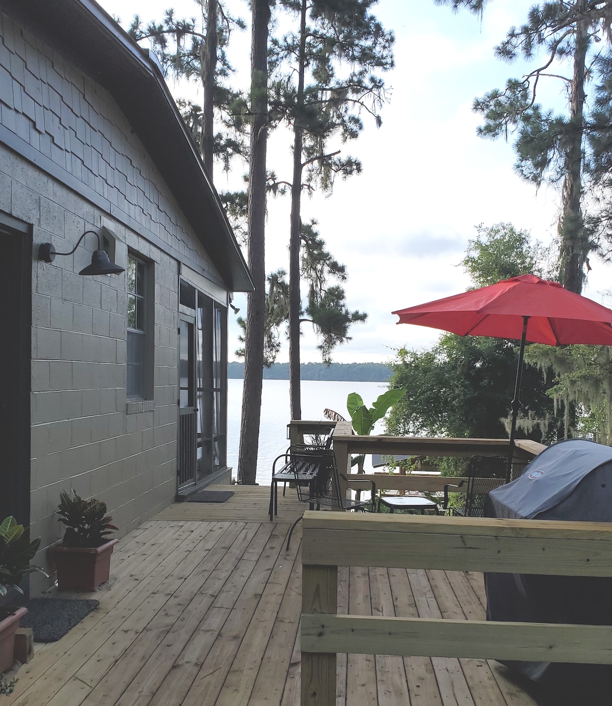 Close to everything, a million miles away....... Down the two-track driveway, past the view of the nearest neighbors, our new custom cabin awaits. Rest easy on the screened porch, with its view of the two-acre lake or cross the adjacent foot bridge to the island. Fish for bass and bream, stroll the walking path, paddle around and enjoy the wildlife, or just relax far from the madding crowd. This slice of paradise sits on 12 acres; our home is across the lake, out of sight and out of mind.